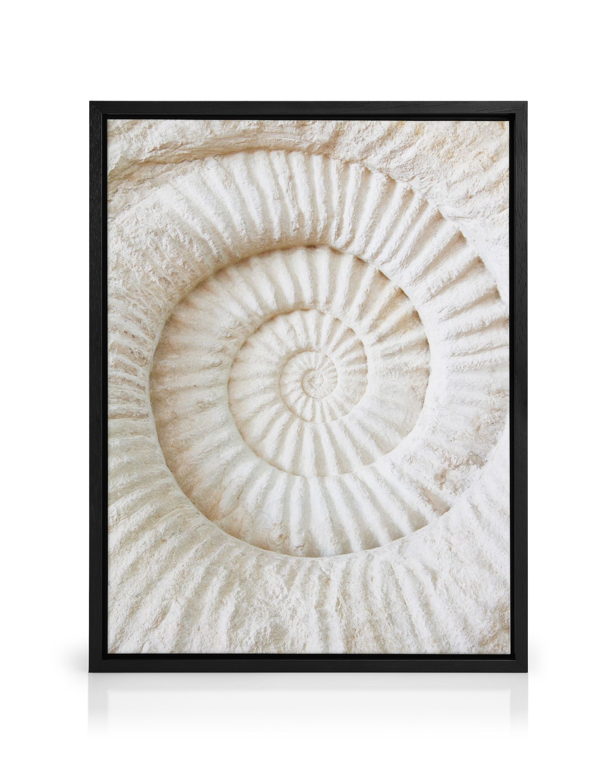A print showing an ammonite fossil in beige and white tones with detailed ridges.