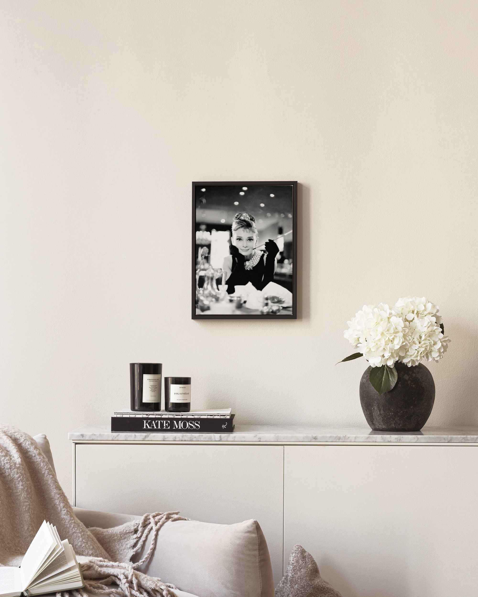 From $18.60A black and white canvas print of Audrey Hepburn playing Holly Golightly in Breakfast at Tiffany's wearing a tiara, pearl necklace, and long black gloves. Perfect wall art for a classic and sophisticated look.