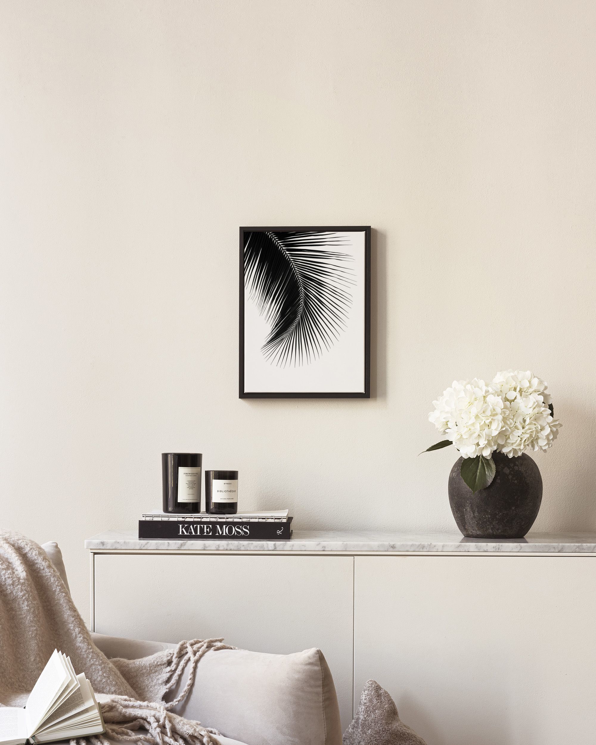 A black palm leaf print with long, pointed fronds on a white background. Simple and elegant poster with striking contrast between black and white.