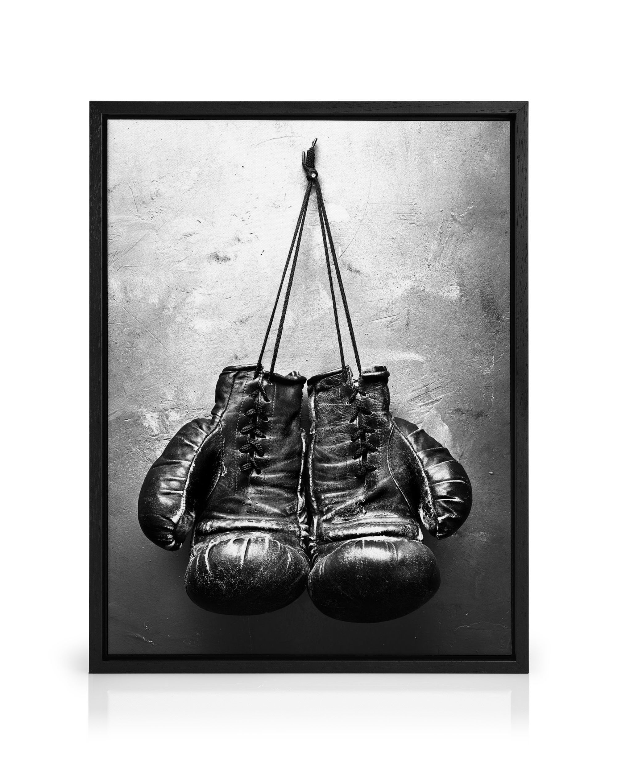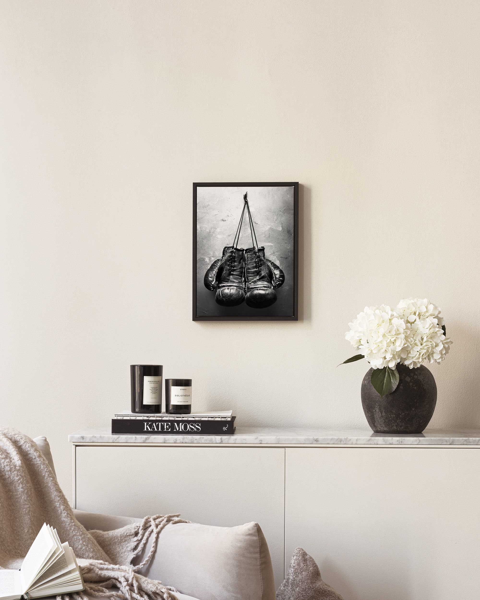 Black boxing gloves hanging on a grey textured wall. This black and white print creates a cool sporty look for your home.