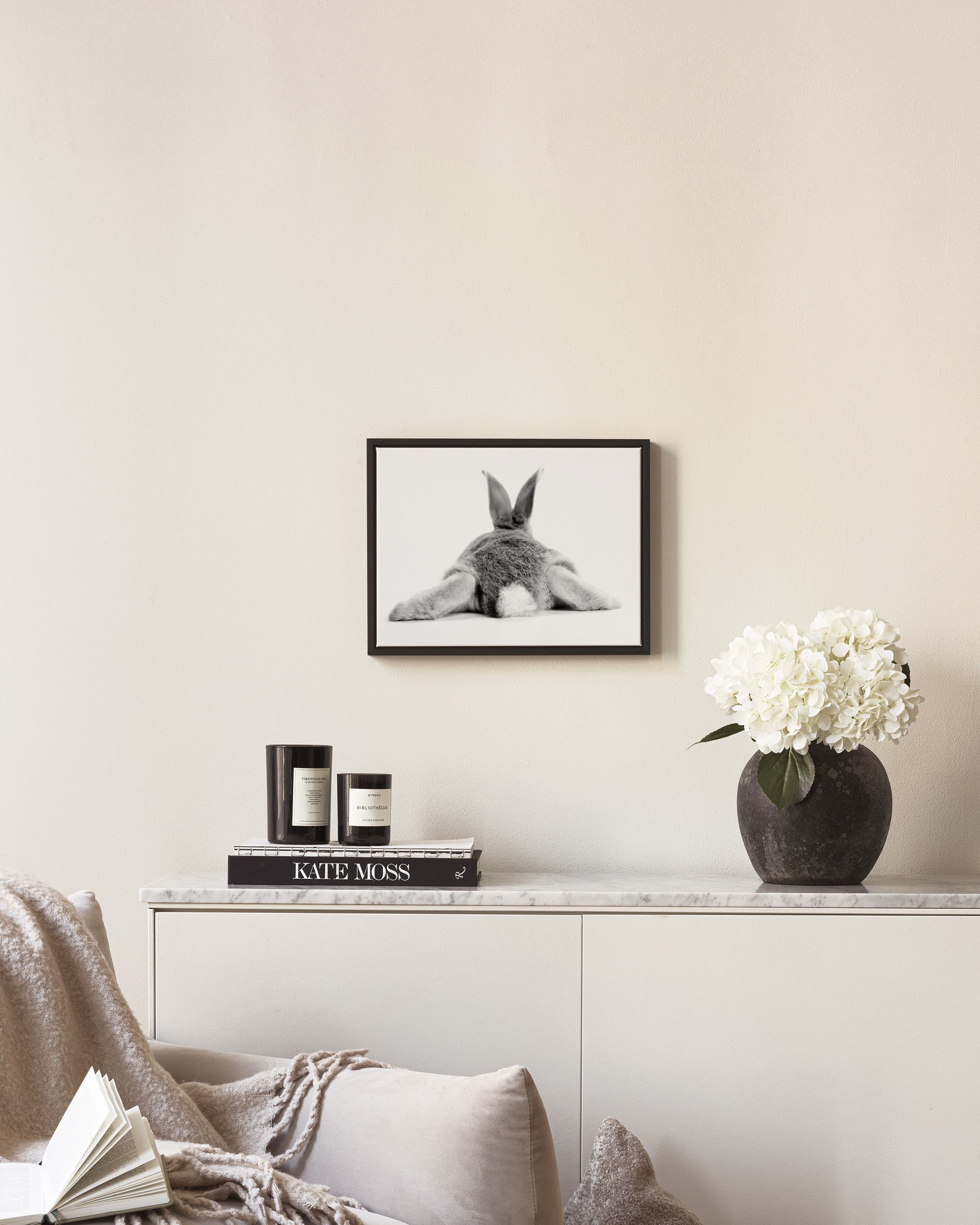 A grey rabbit print with fluffy fur, lying down with its back to the viewer. The bunny has upright ears and a small white tail against a white background.