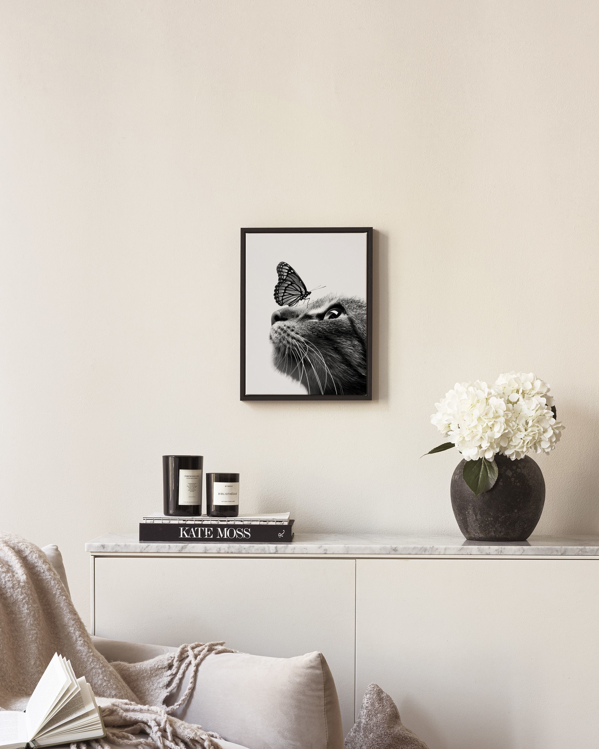 A black and white print of a cat looking up at a butterfly on its nose. The cat has detailed whiskers and the butterfly shows intricate wing patterns on a white background.