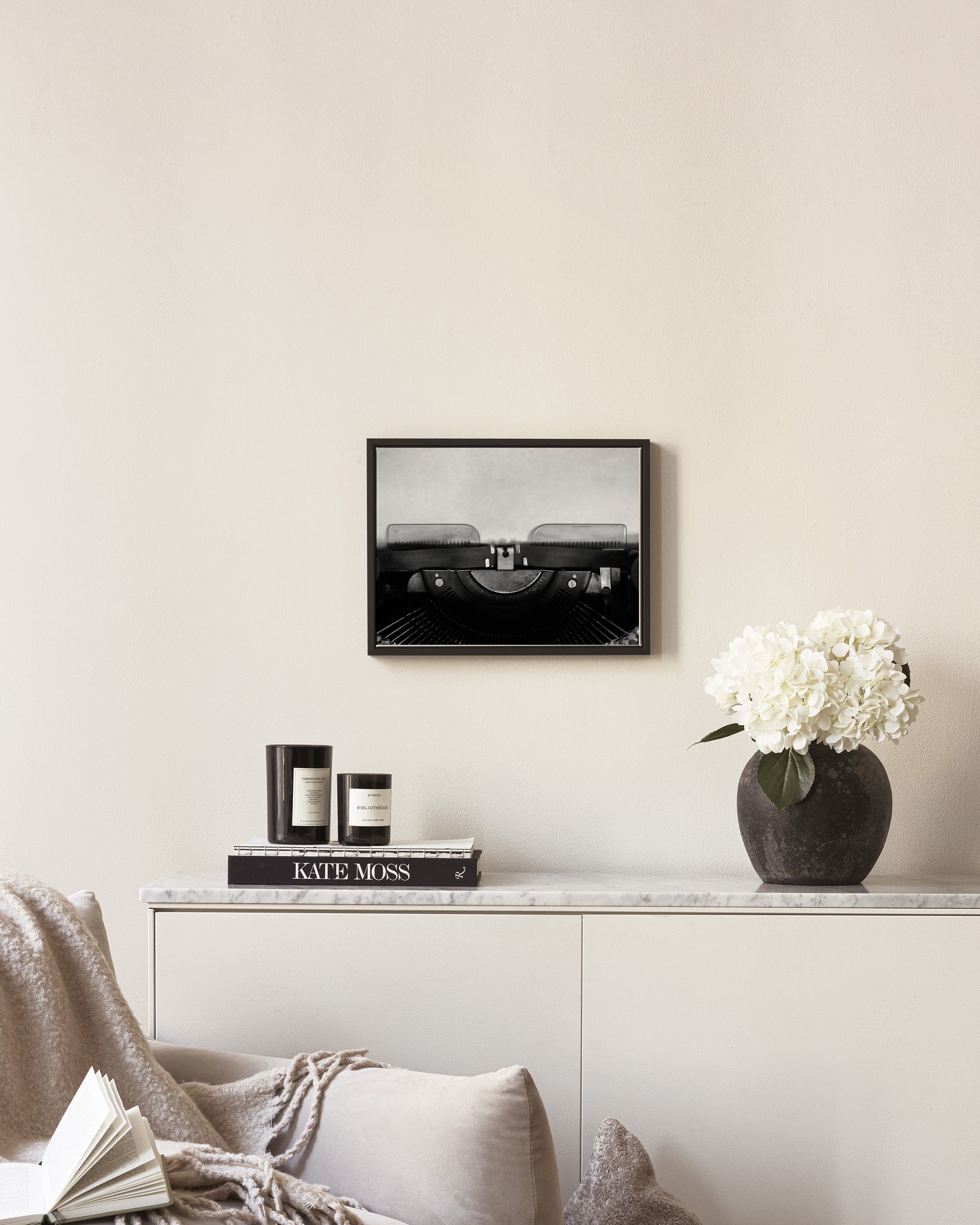 A black and white print of a vintage typewriter with blank paper. Classic design with metal details and smooth texture.