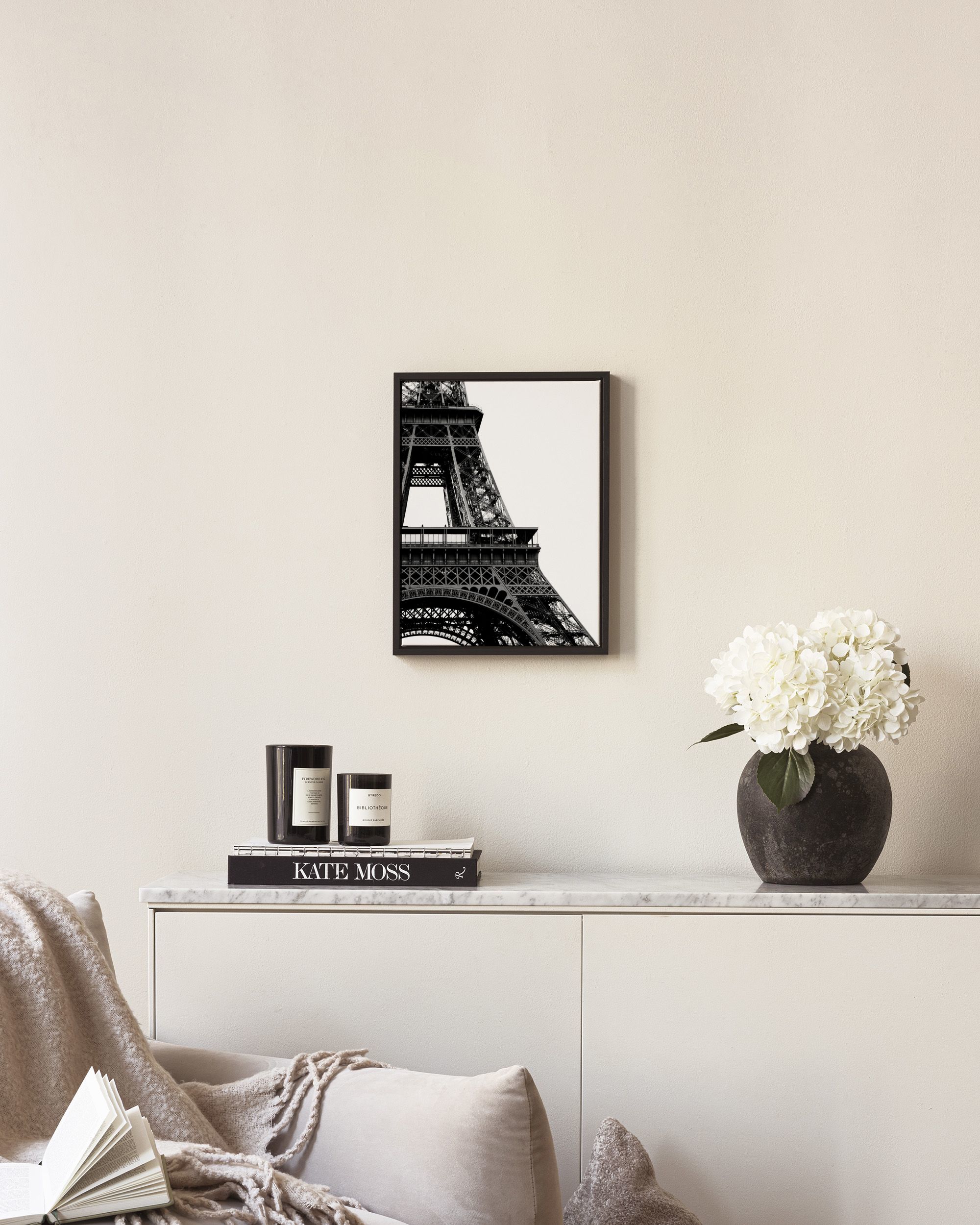 Black and white print of the Eiffel Tower showing detailed metal beams. A classic architectural poster perfect for any room.