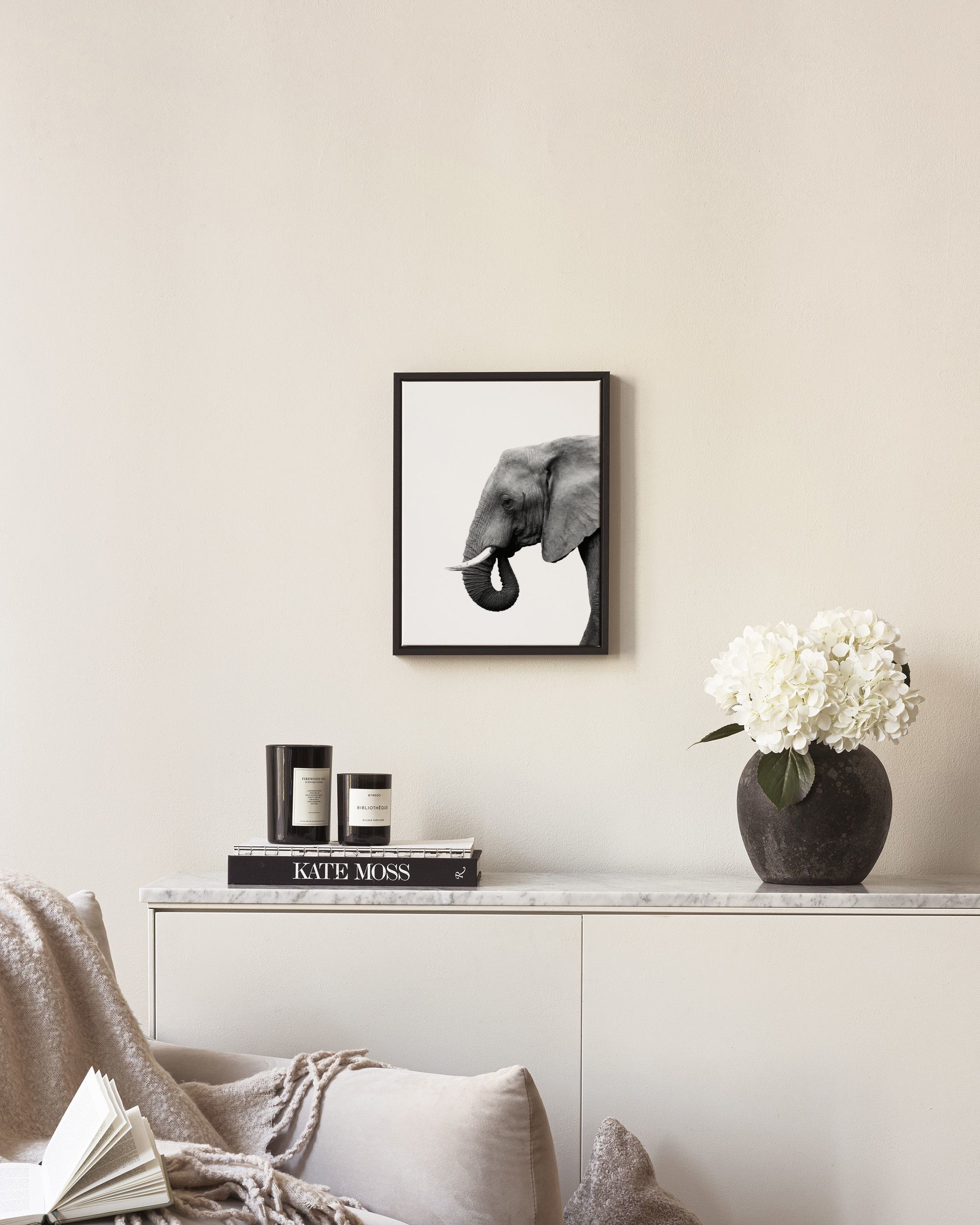 A black and white print of an elephant with a long trunk and large ears. This striking animal print features detailed wrinkles and textures against a white background.