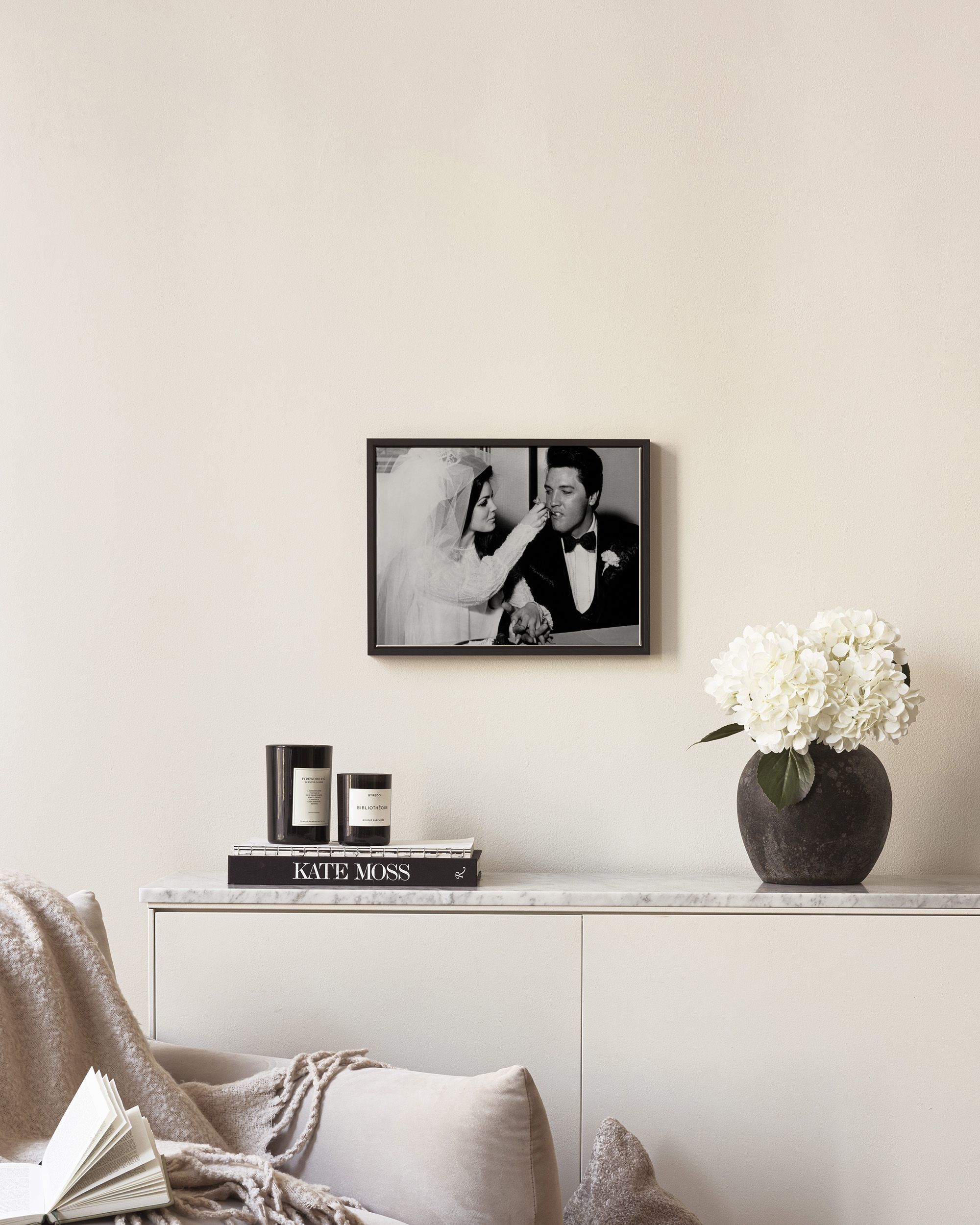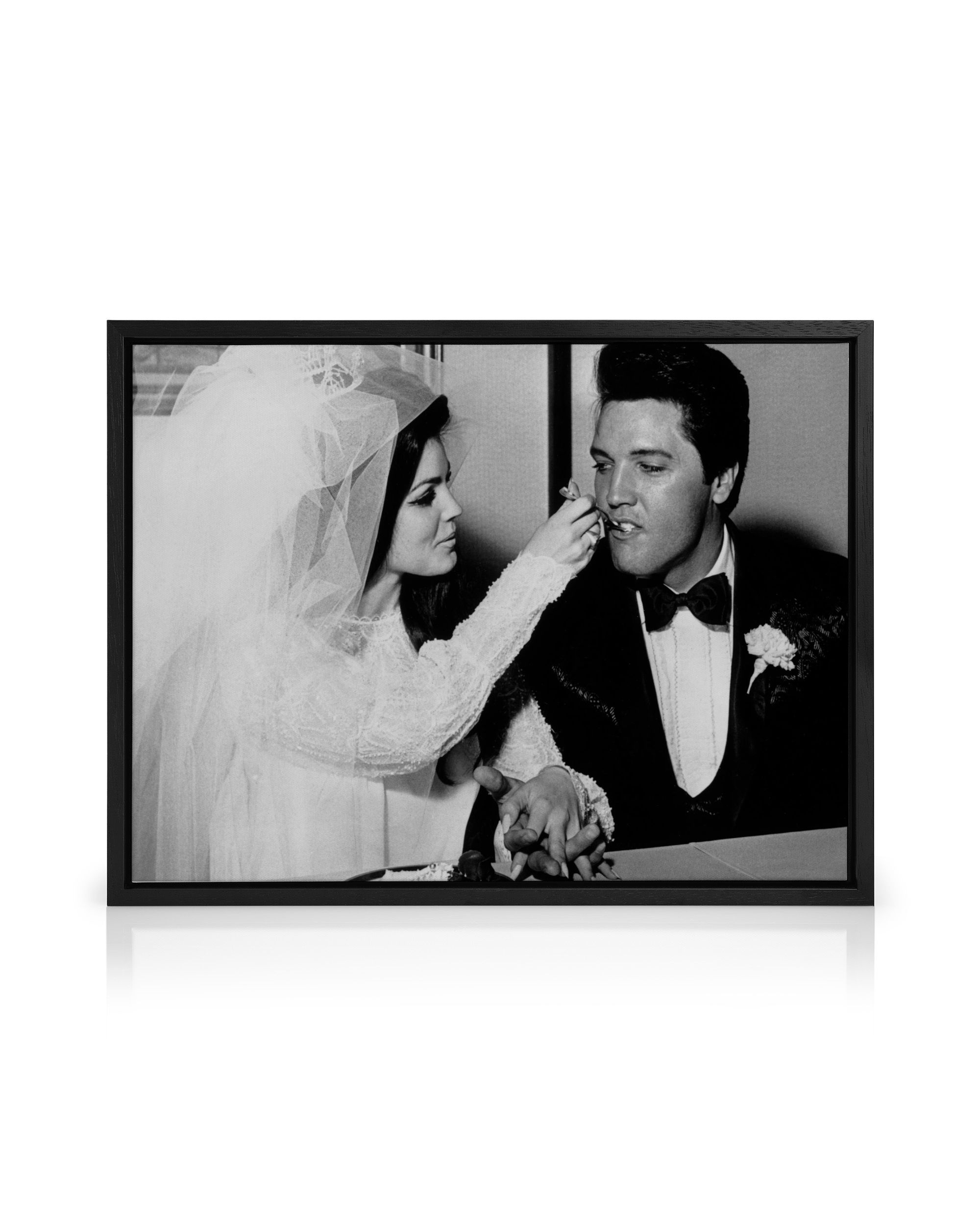 A black and white canvas print of Elvis and Priscilla Presley sharing wedding cake. A romantic moment captured in soft textures and timeless elegance.