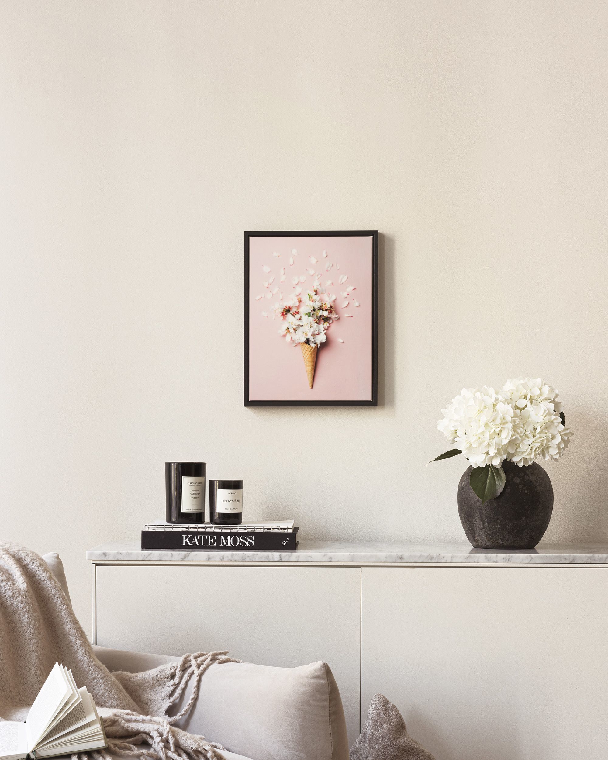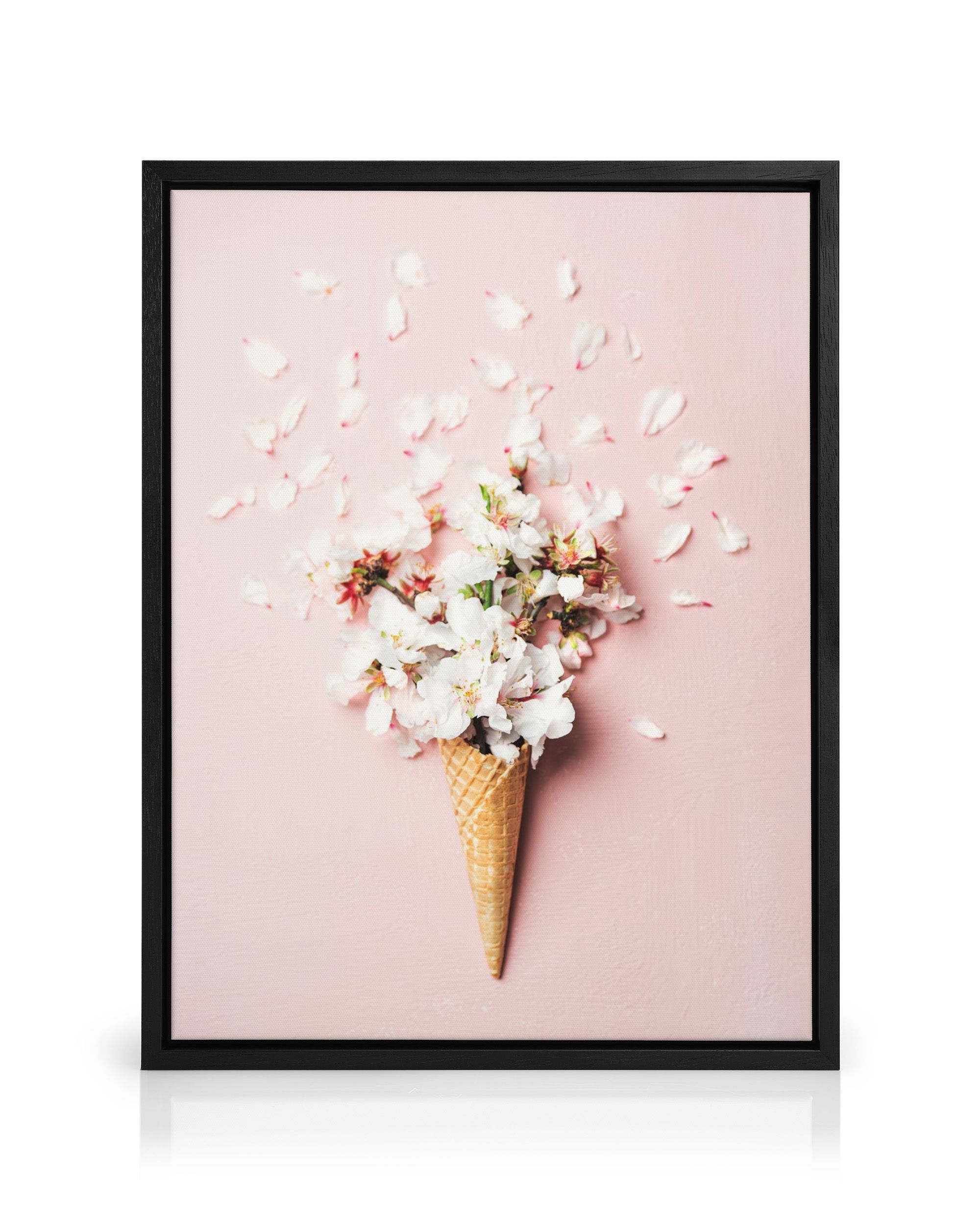 A whimsical print of a waffle ice cream cone filled with white flowers with pink tips. Scattered petals create a soft pattern on a light pink background.