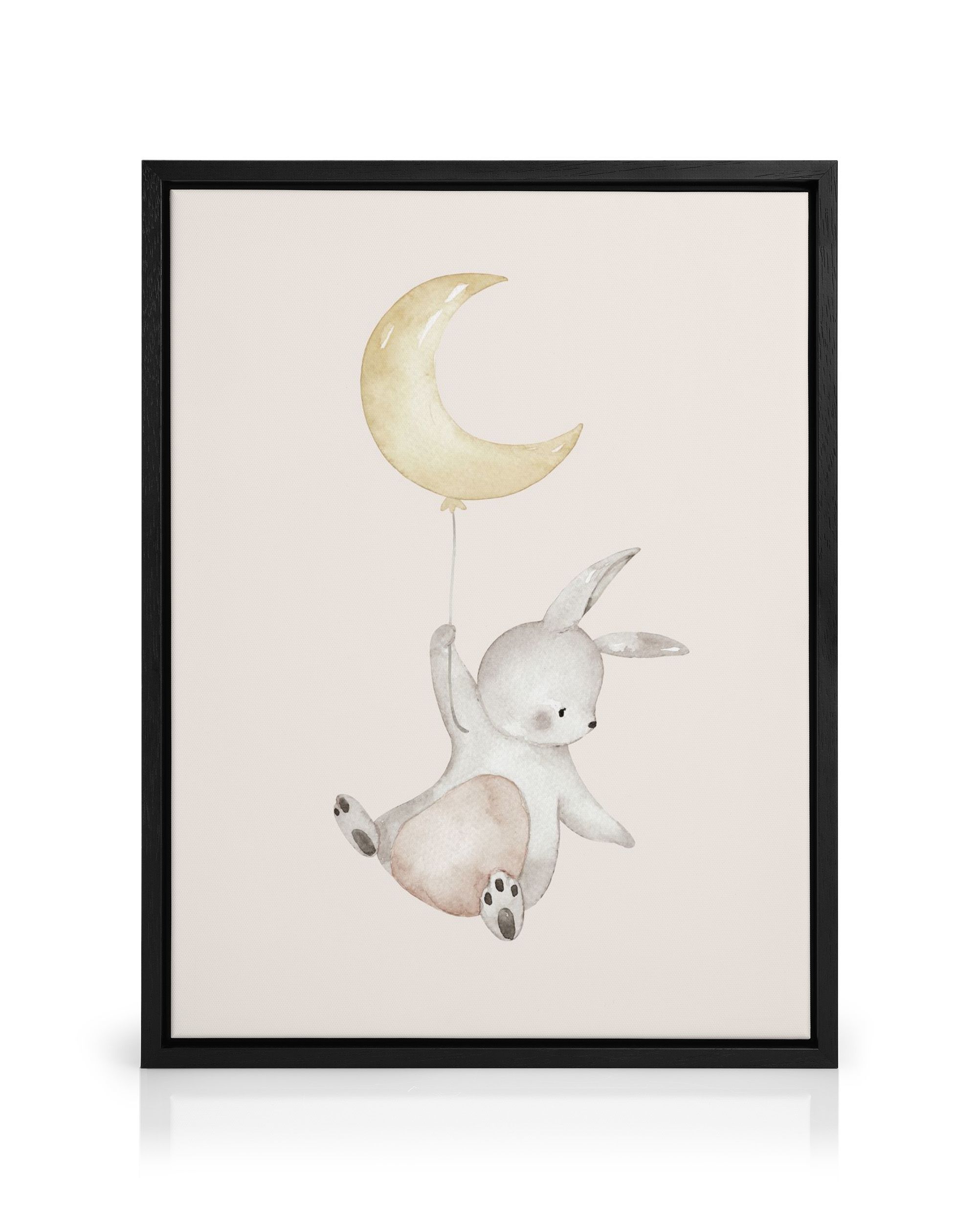 A cute grey bunny holding a string attached to a yellow moon. Watercolour print with a gentle feel on a light beige background.