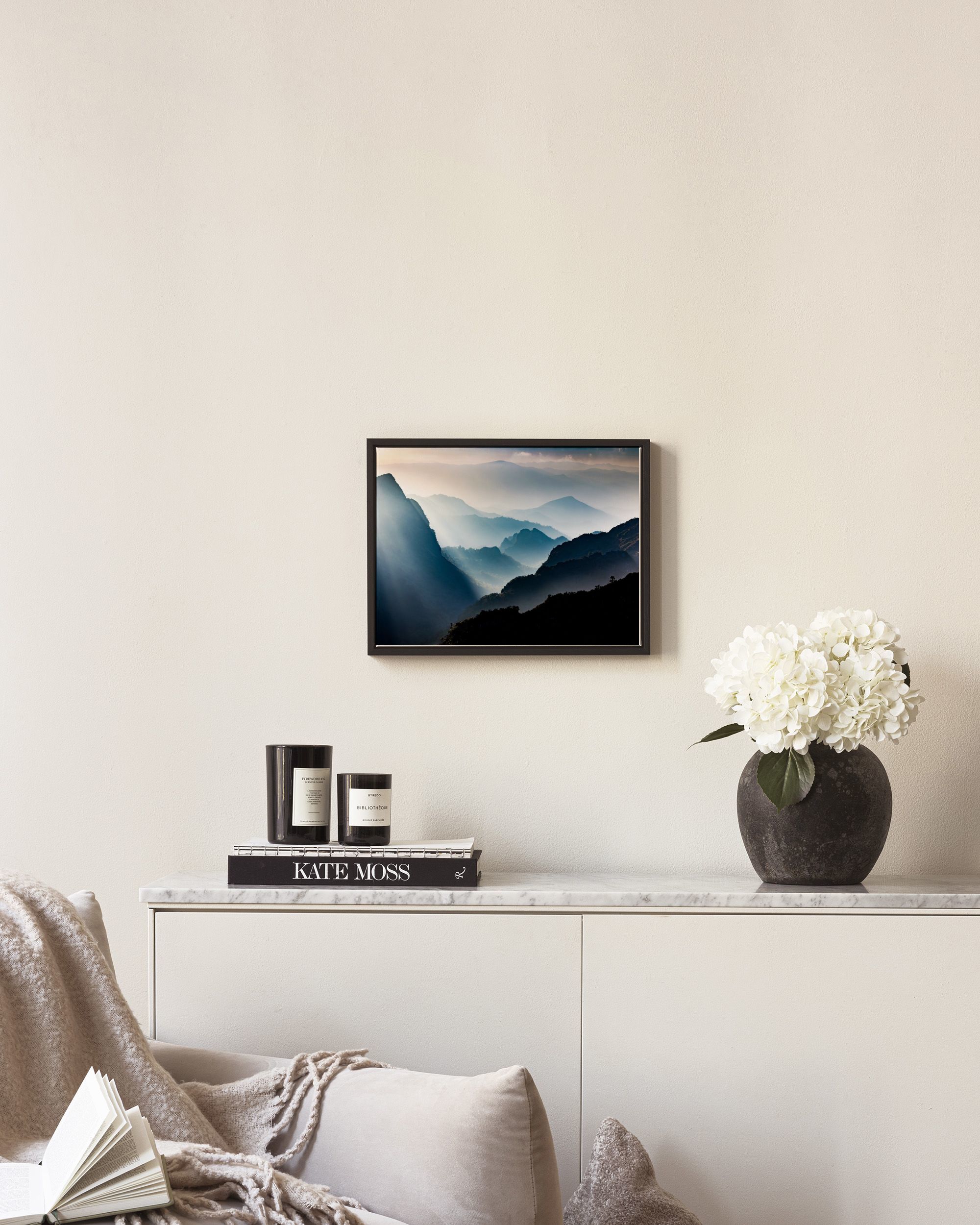 A beautiful print of mountains in soft blue tones with sunlight streaming through the mist.