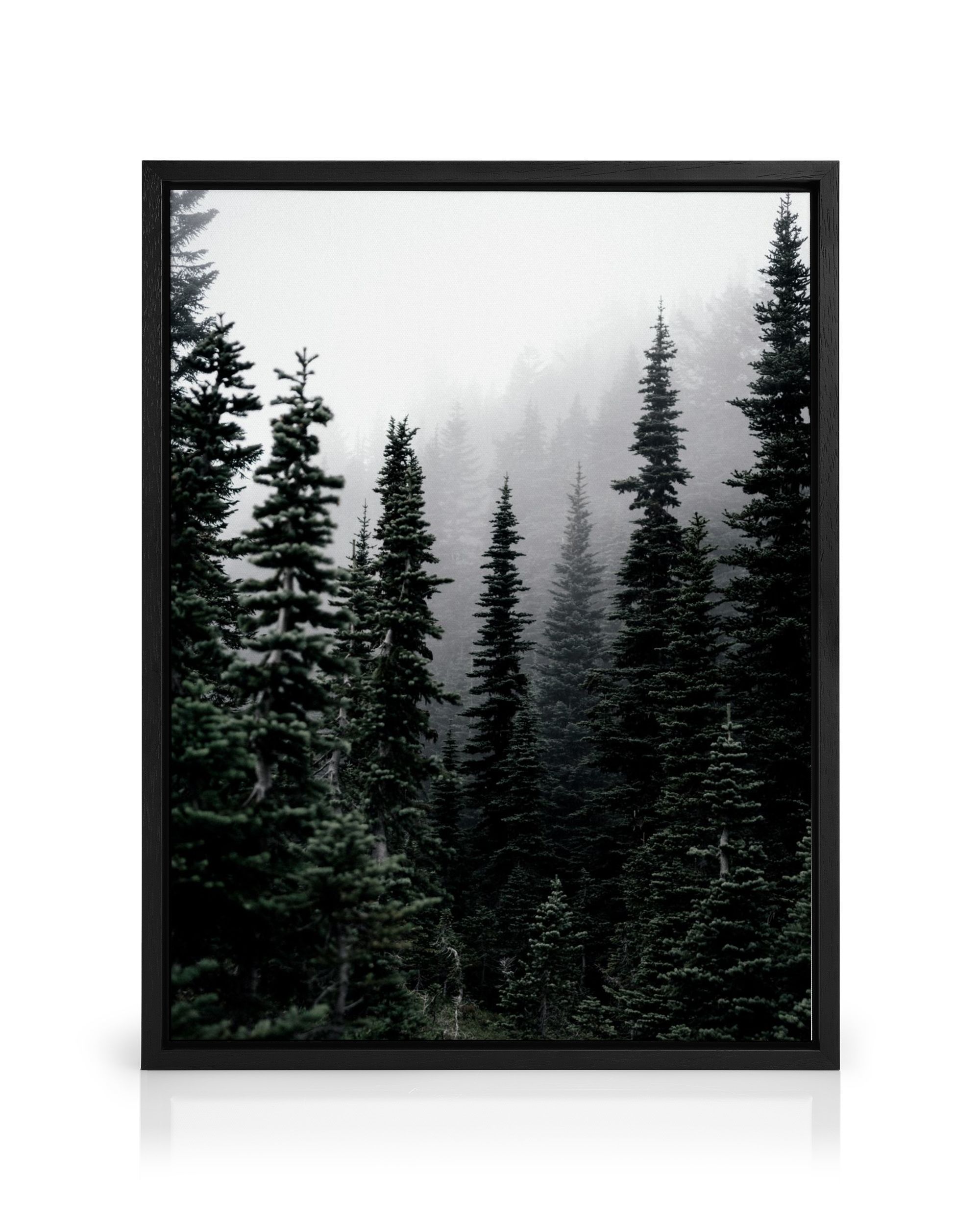 A moody forest print featuring tall evergreen trees in dark green surrounded by soft mist and fog. Perfect nature poster for creating a calm atmosphere in your home.