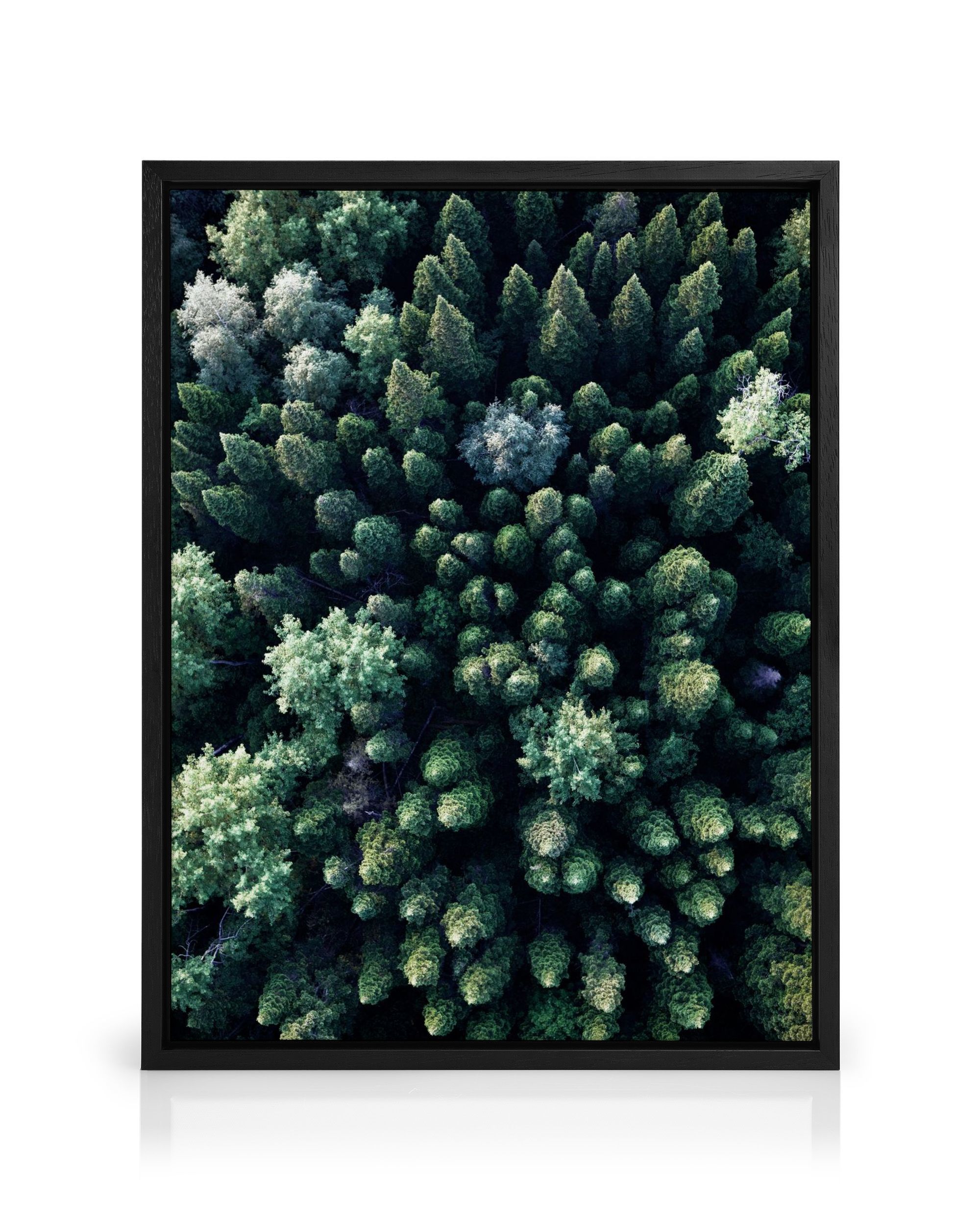 Aerial view print of a dense forest with trees in different shades of green, from dark to light green with hints of grey.