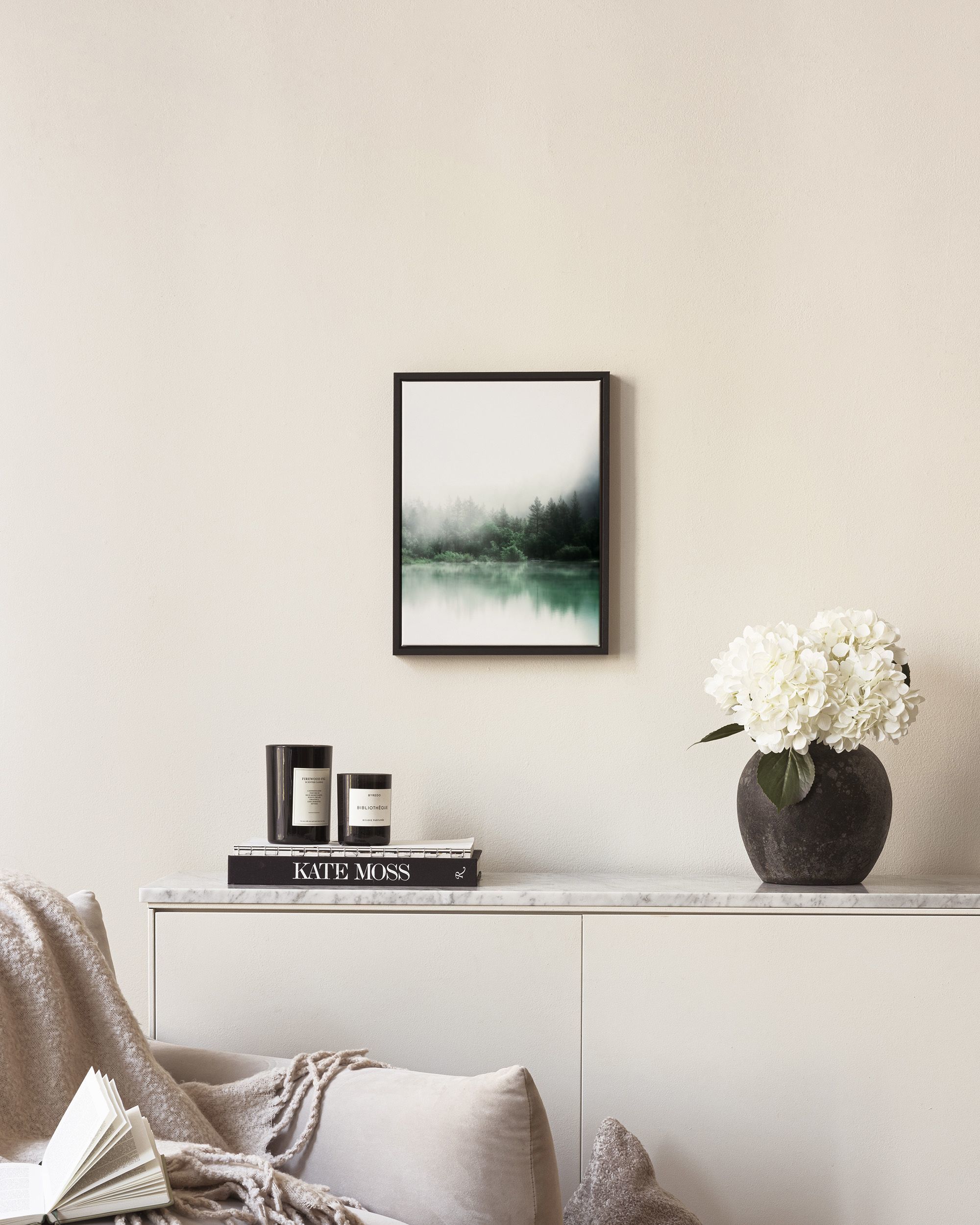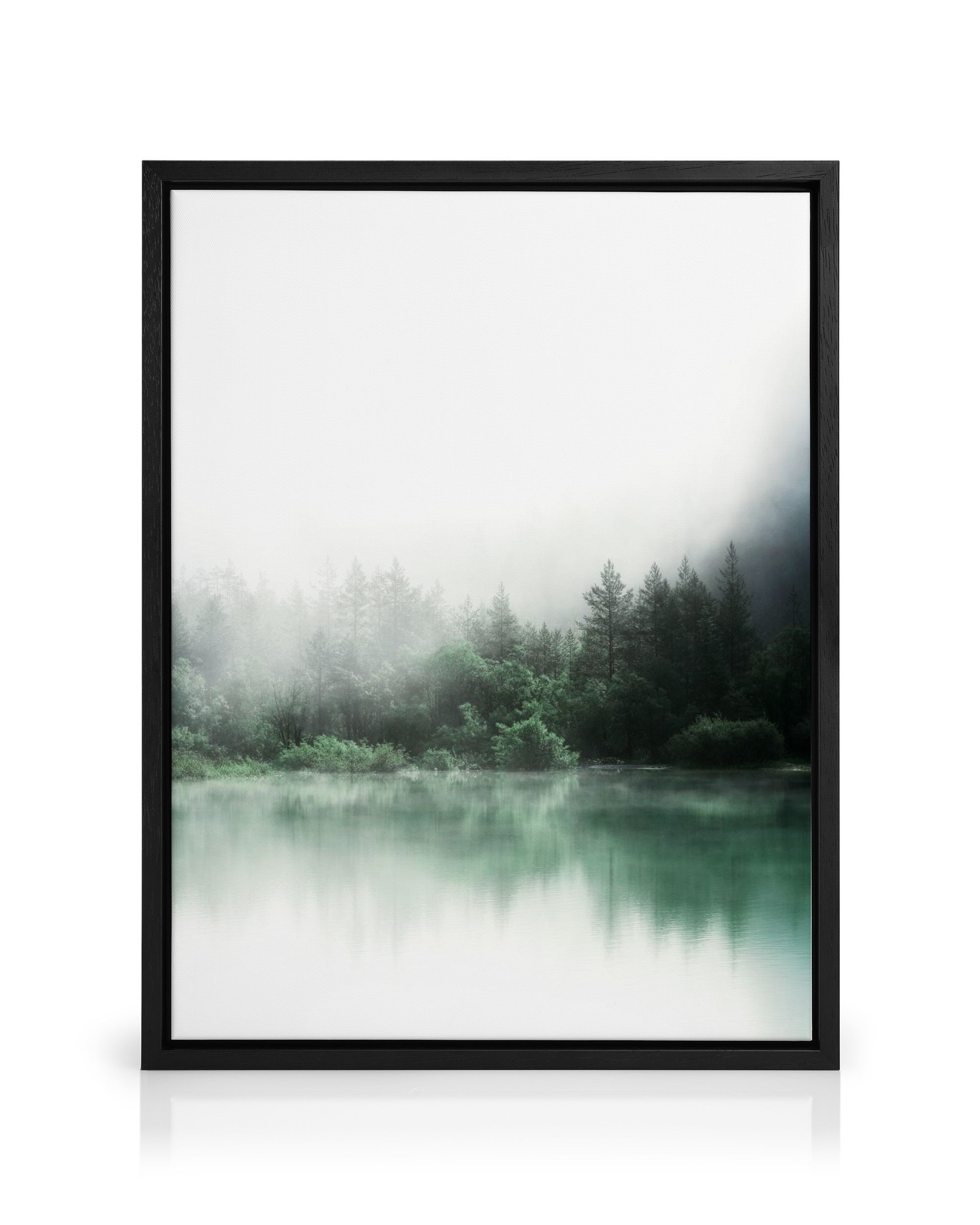 A peaceful forest print with tall dark green trees reflected in calm water, surrounded by soft white mist.