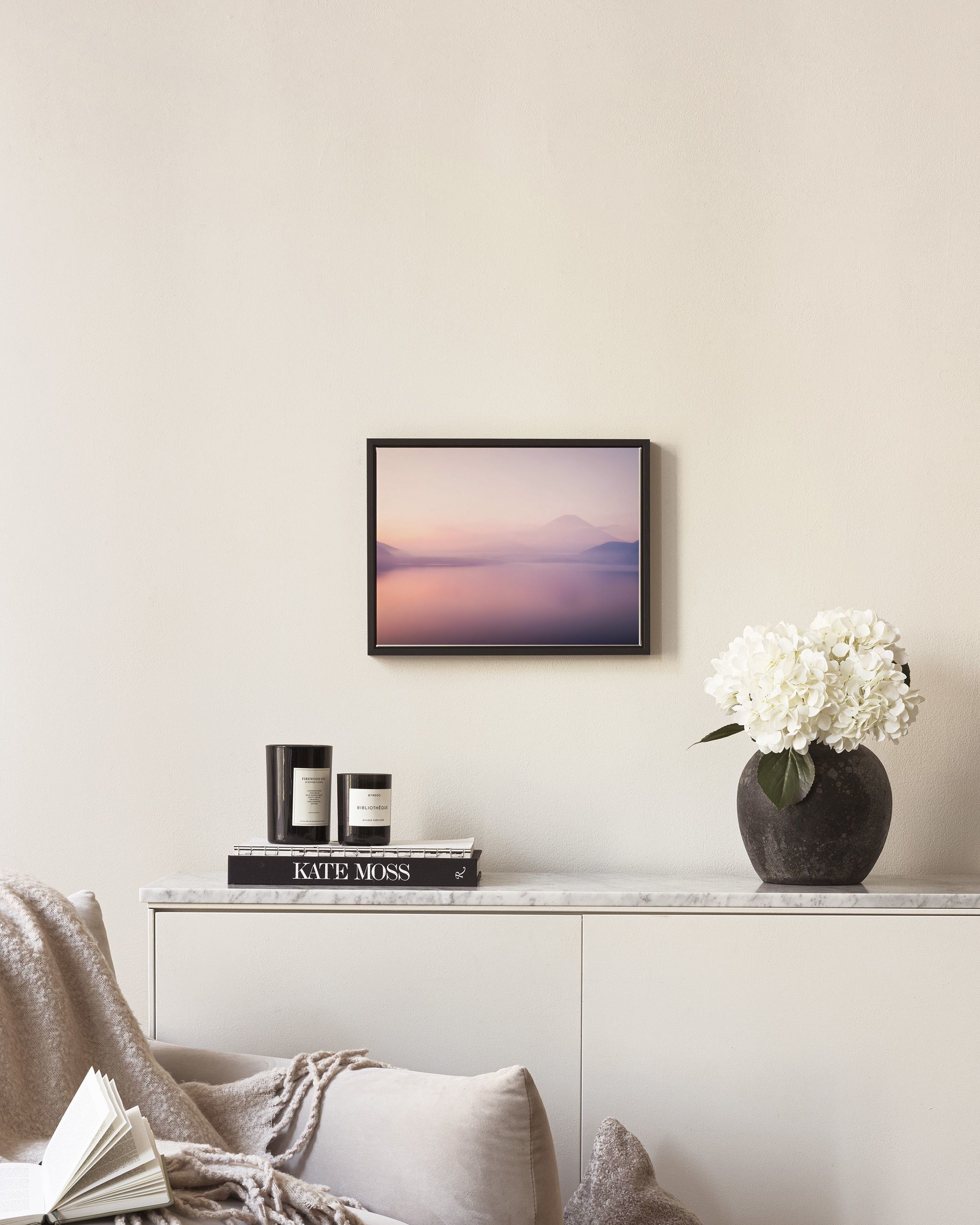 A dreamy print of Mount Fuji over a misty lake in soft pink and purple colours. Perfect for creating a calm and peaceful atmosphere in your home.