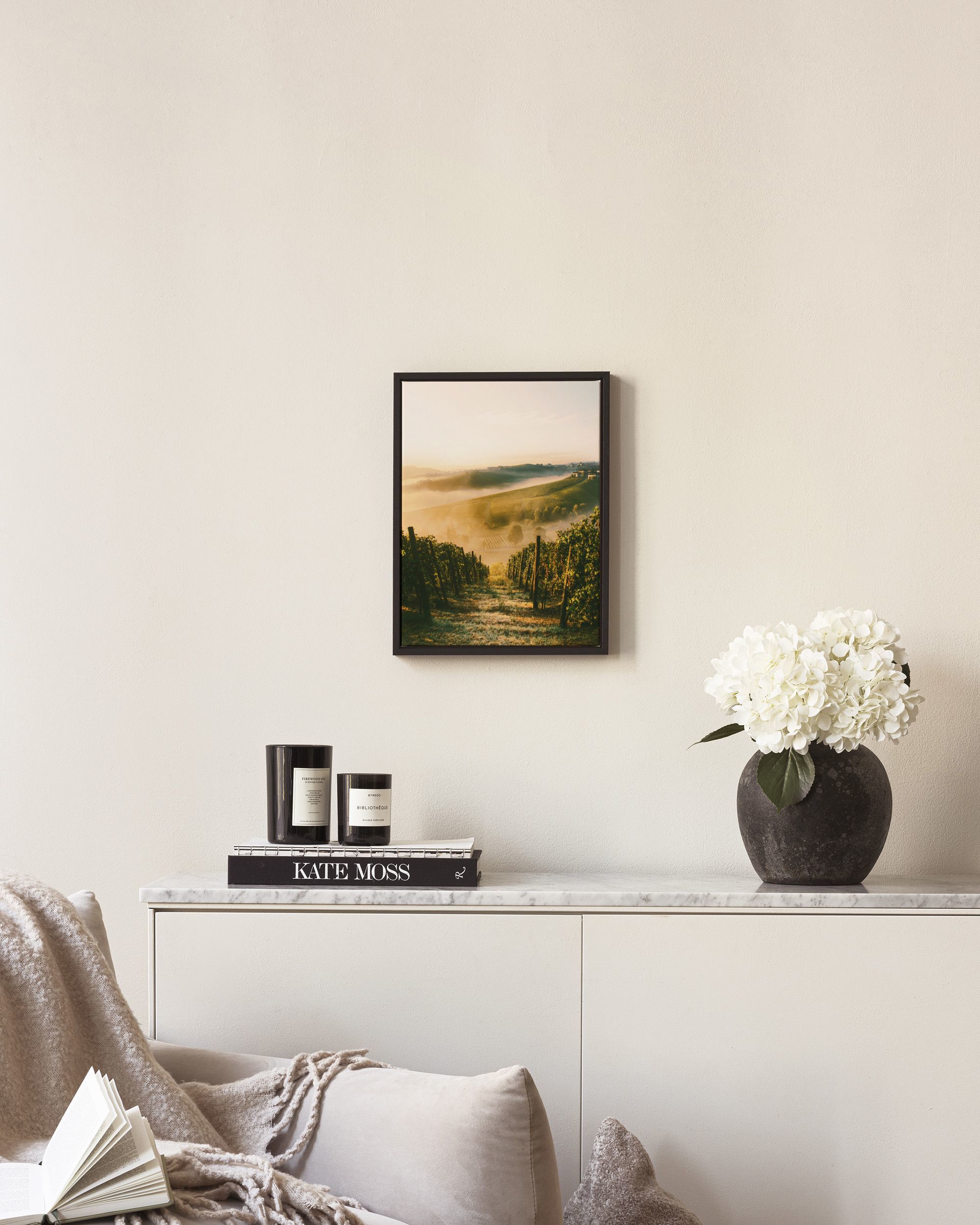 A beautiful print of vineyard rows across rolling hills in soft golden light. Perfect for bringing a peaceful countryside feel to your home.