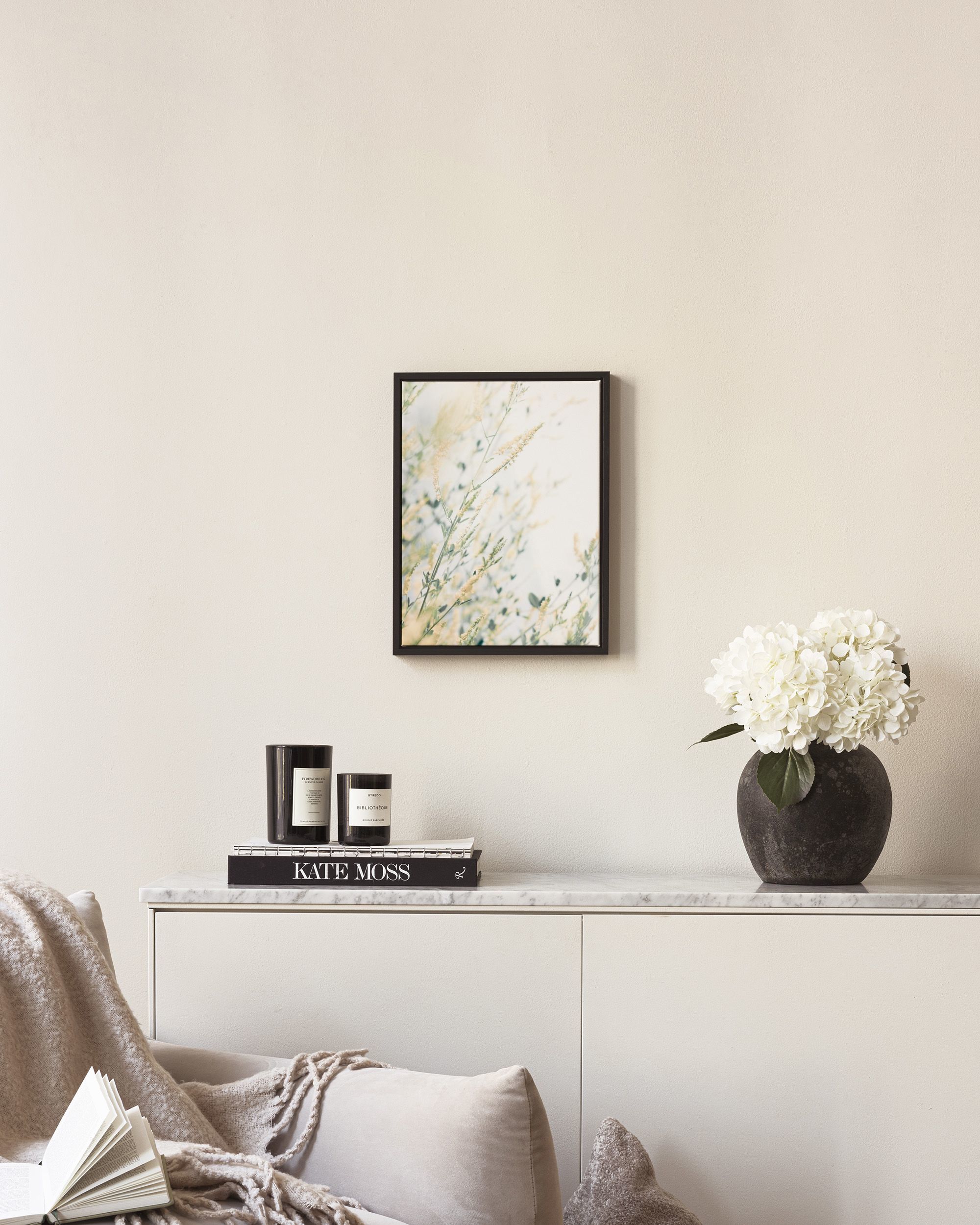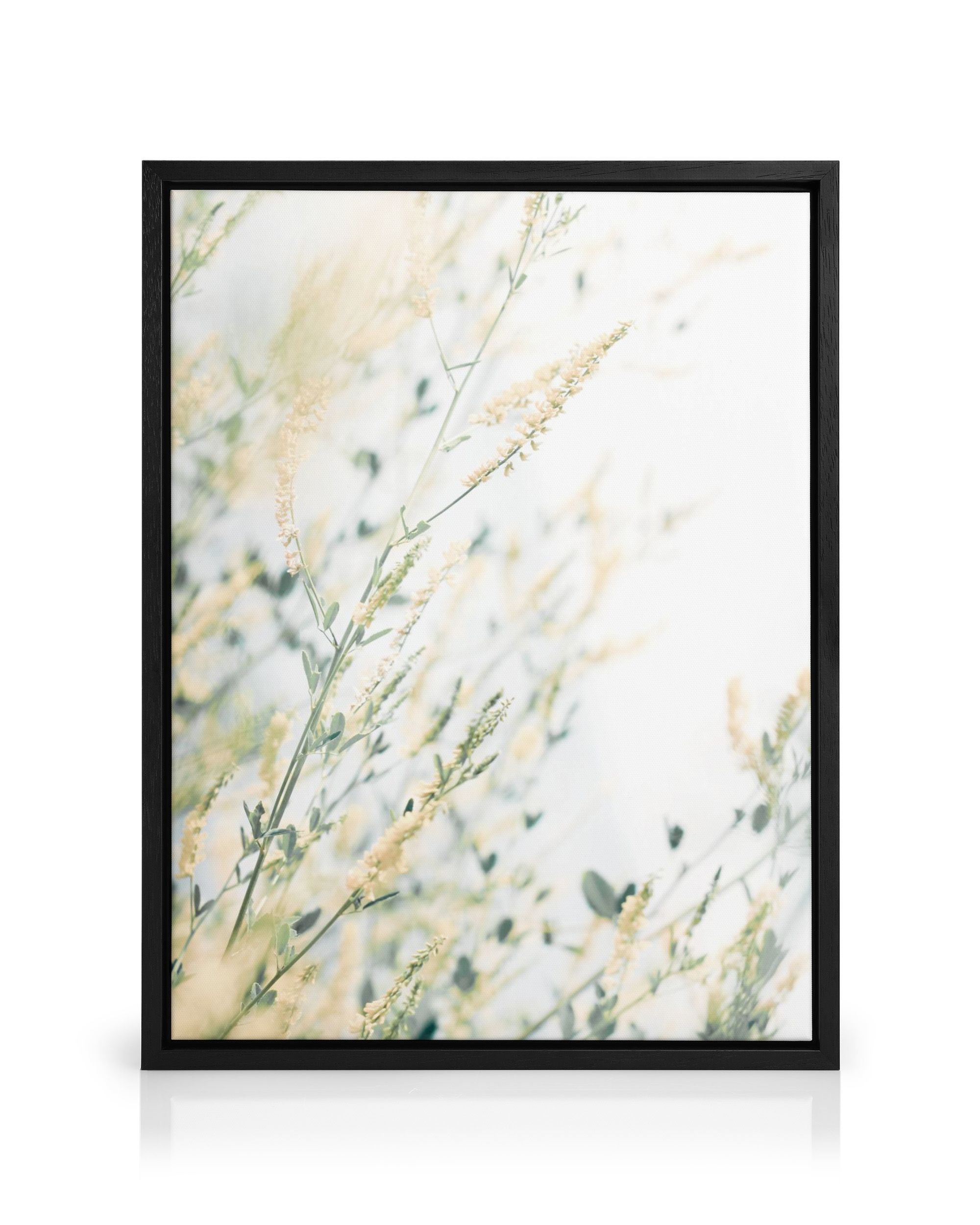 A botanical print with pale yellow flowers on green stems against a soft background. A lovely poster for your home.