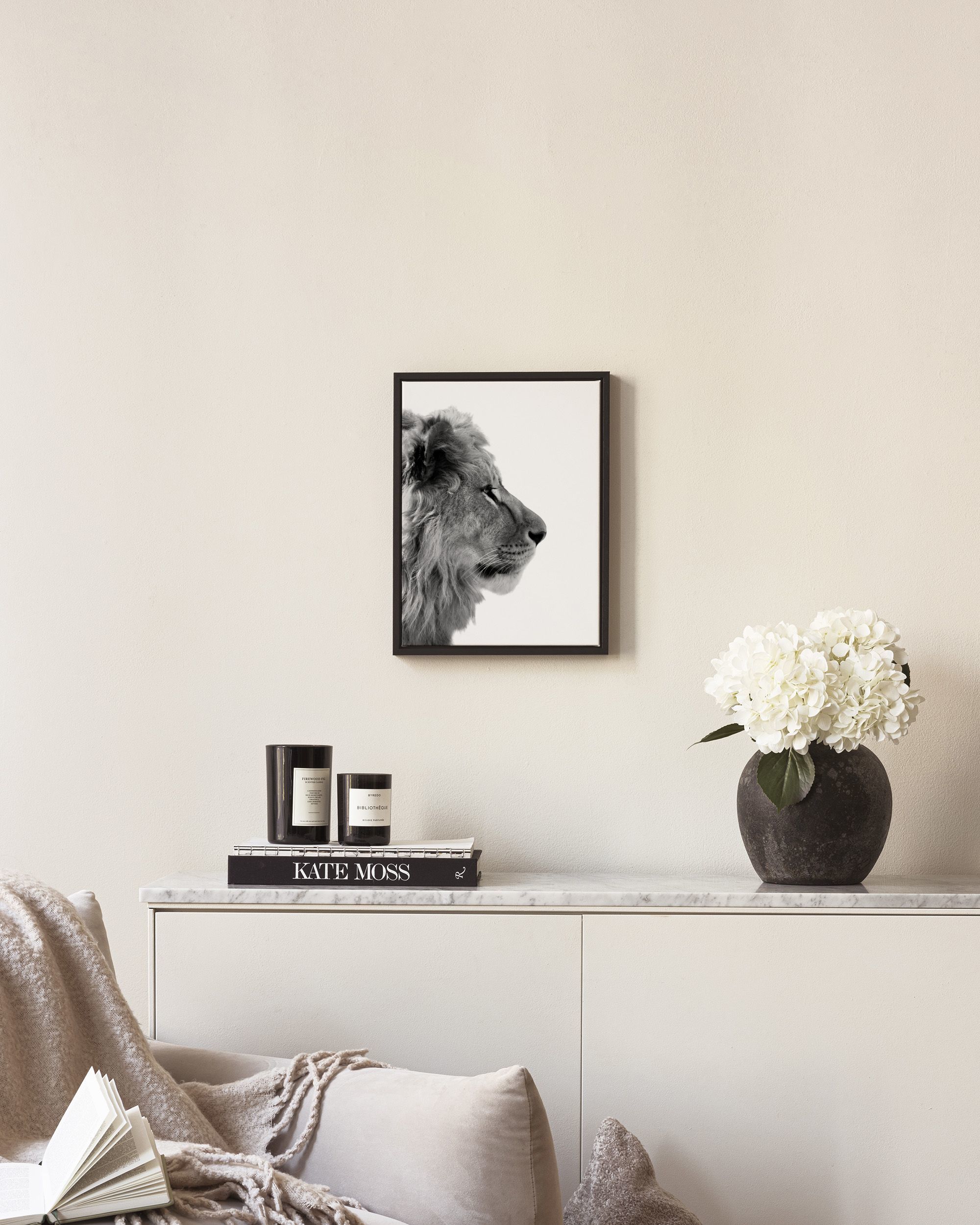 A black and white print of a lion's side profile with a thick mane and strong features against a plain white background. Majestic animal poster with a calm look.