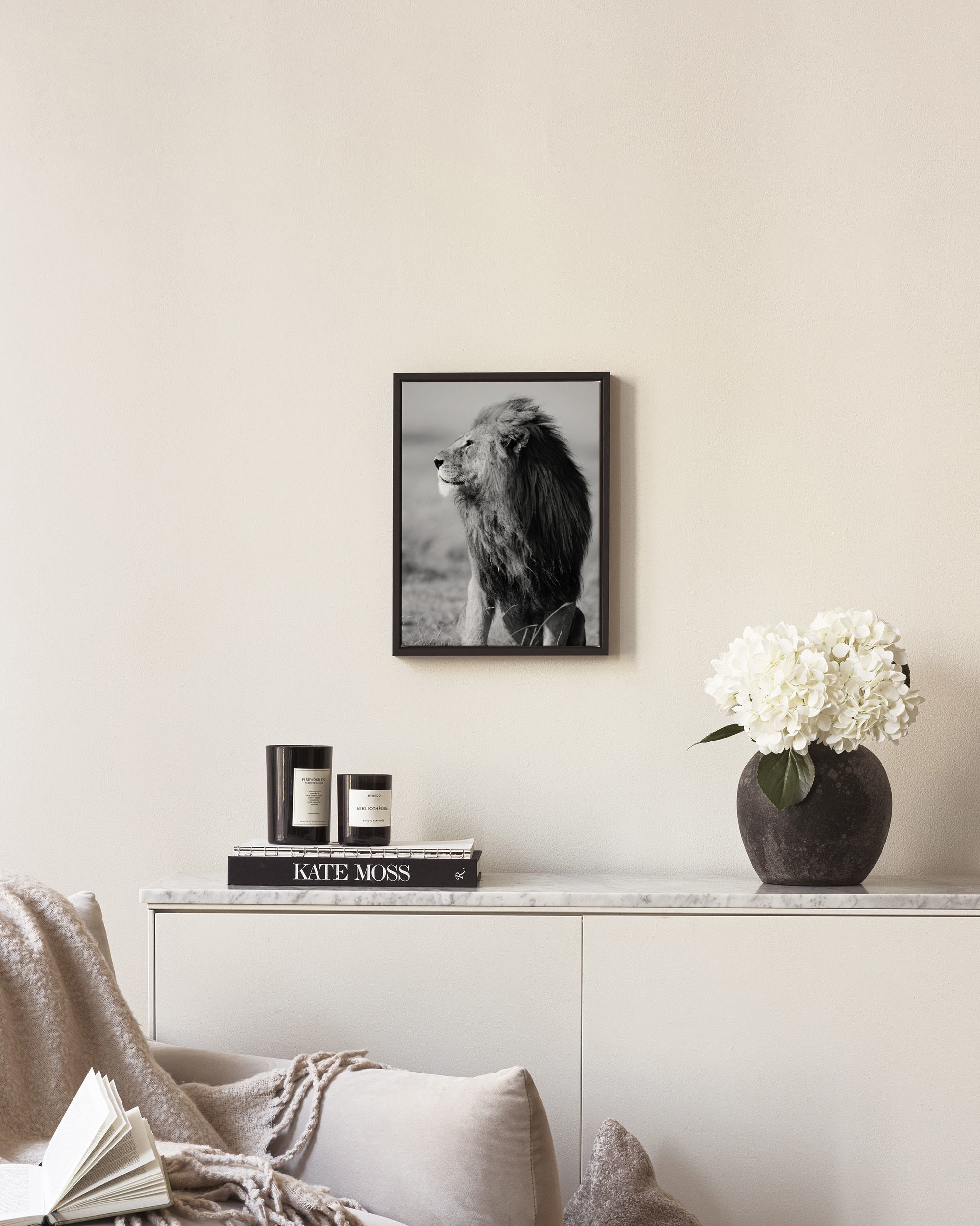 A black and white print of a lion with a thick mane sitting in a grassy field. The detailed artwork shows the lion's features against a blurred background.