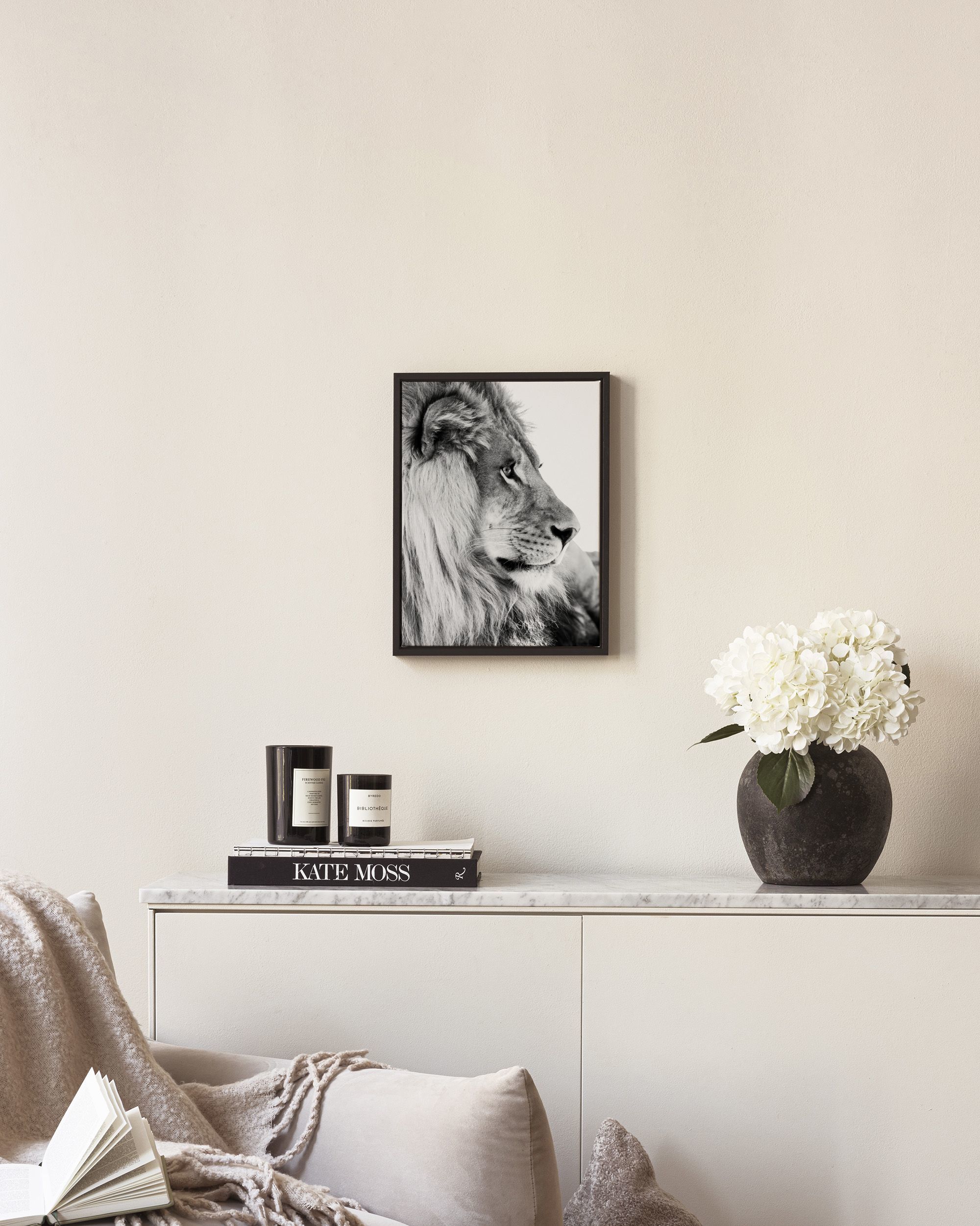 A black and white print of a lion in profile with a detailed mane and calm expression against a light background.