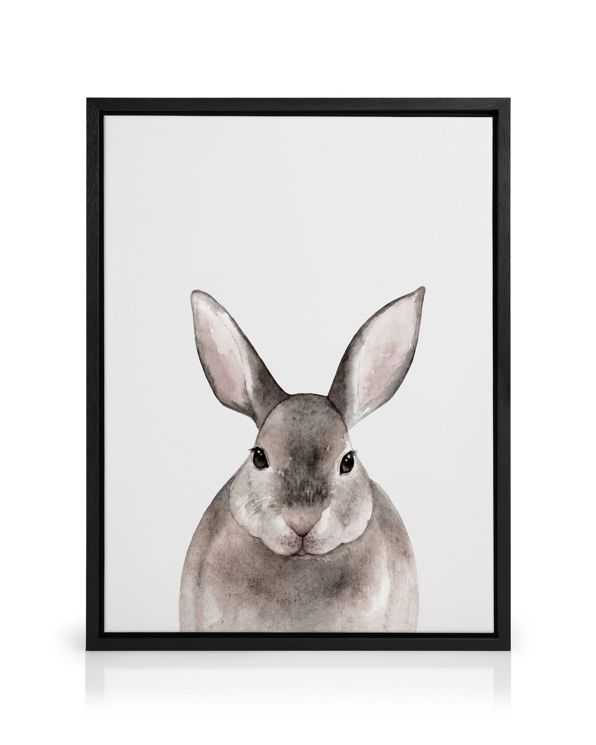 A watercolour print of a cute rabbit with large ears and pink insides. The rabbit has soft grey and brown fur with black eyes on a white background.