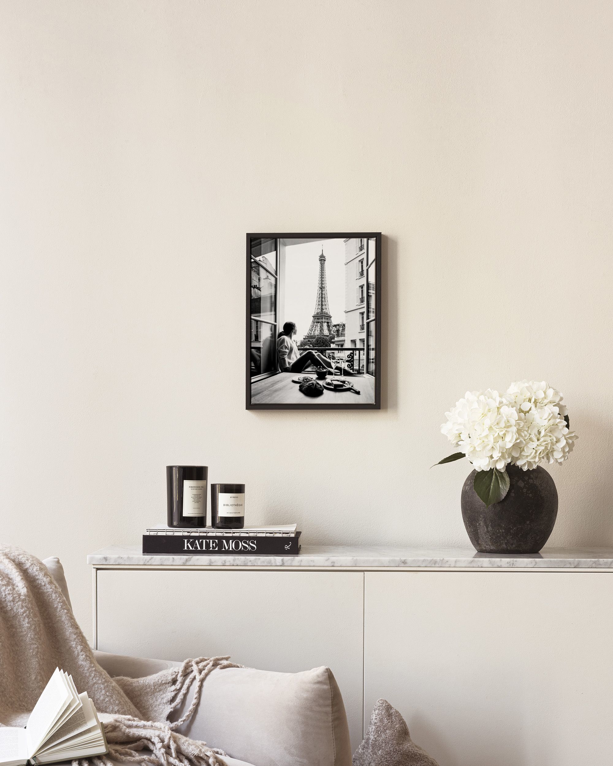 A black and white print of a person having lunch by a window with a view of the Eiffel Tower. Perfect for adding a Parisian touch to your home.