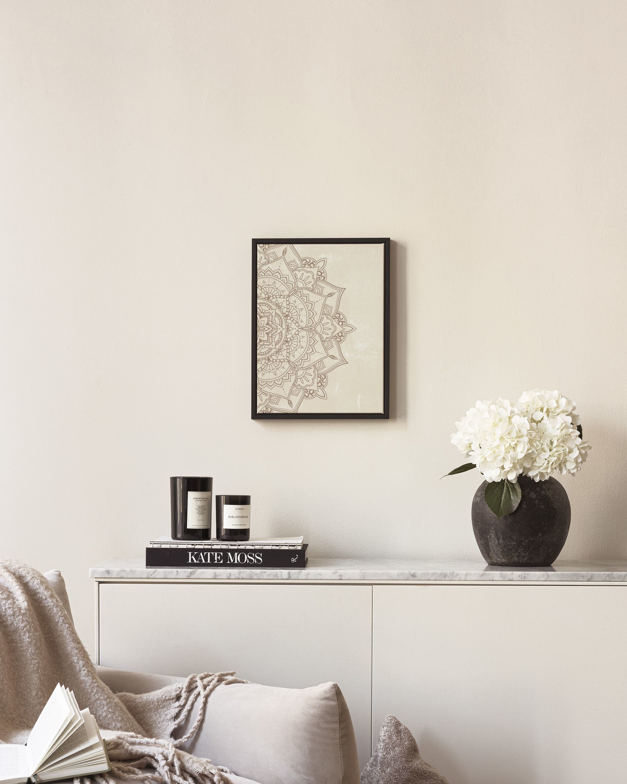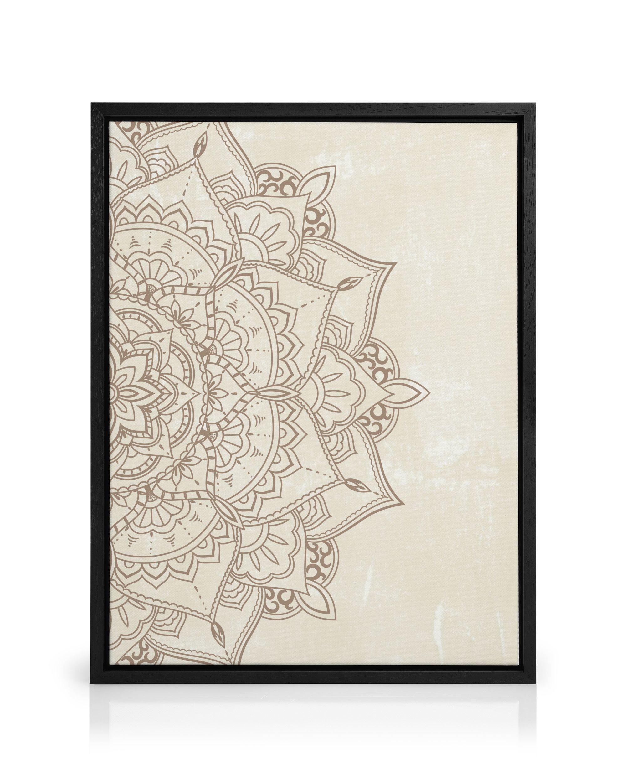 A canvas print featuring an intricate mandala design with floral and geometric patterns in light brown on a soft beige background.