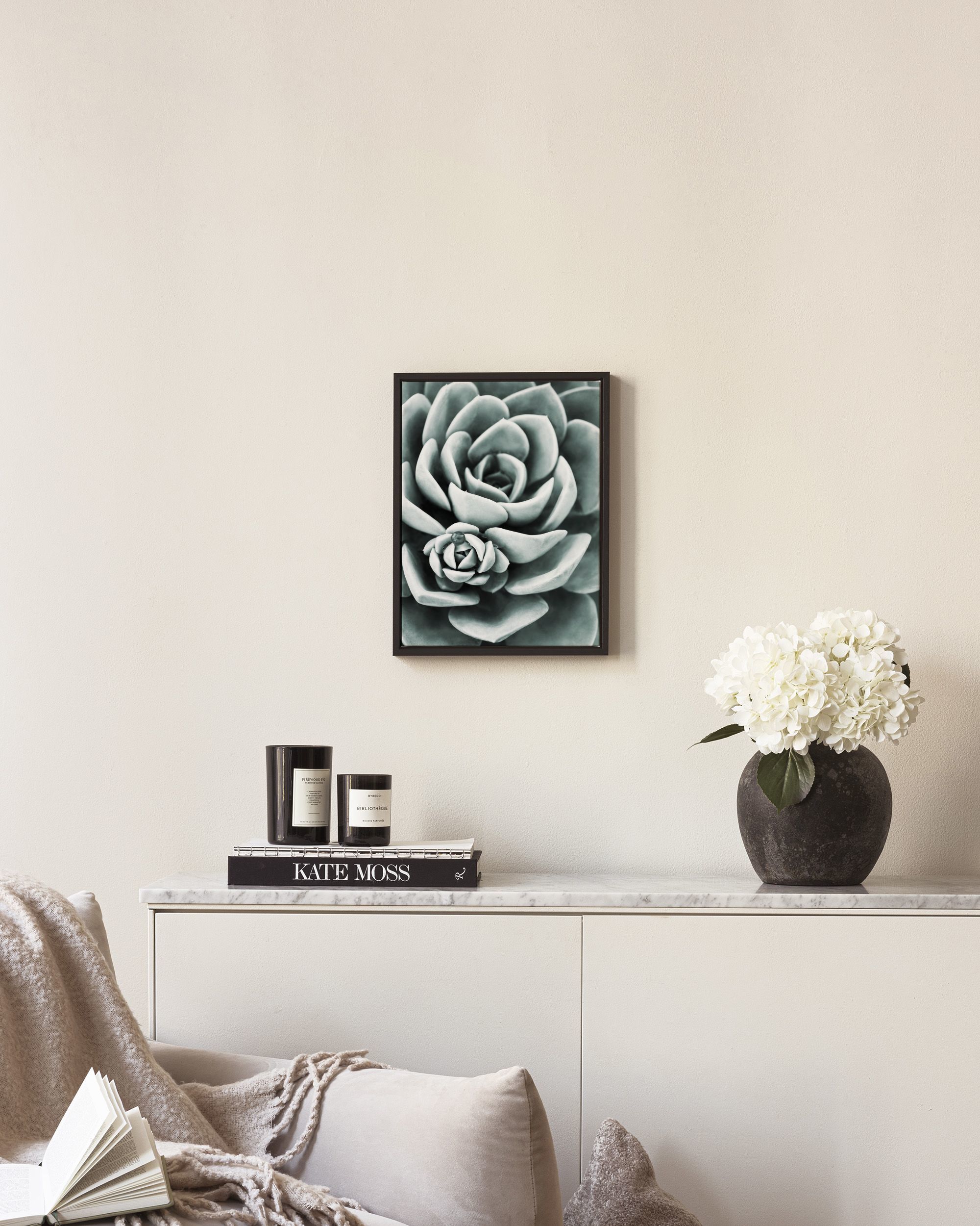 A close-up print of a green succulent plant with thick leaves arranged in a spiral pattern. Perfect botanical poster for your home.