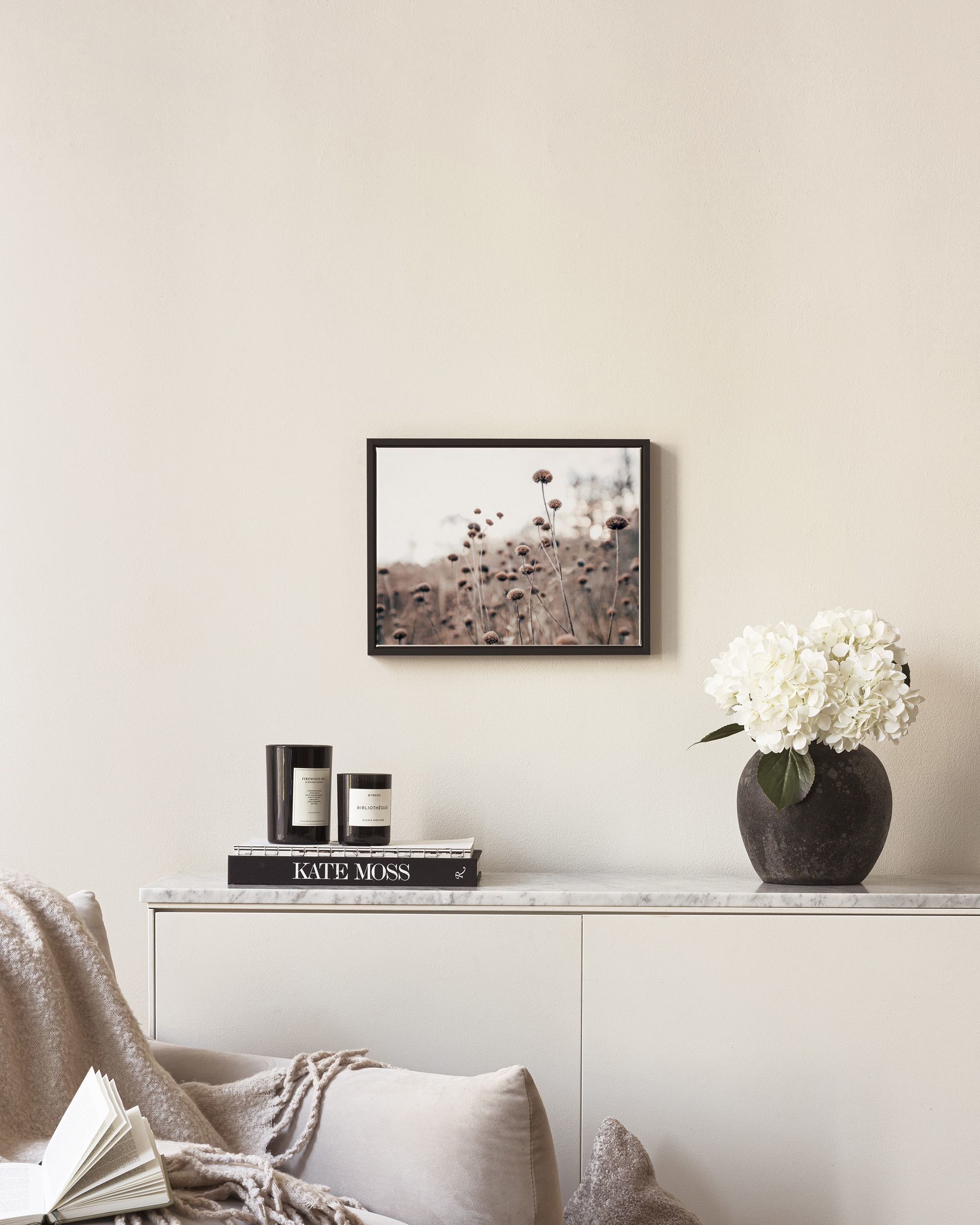 A beautiful print of tall brown flowers with round heads on thin stems against a soft beige and white background. Perfect nature print for your home.