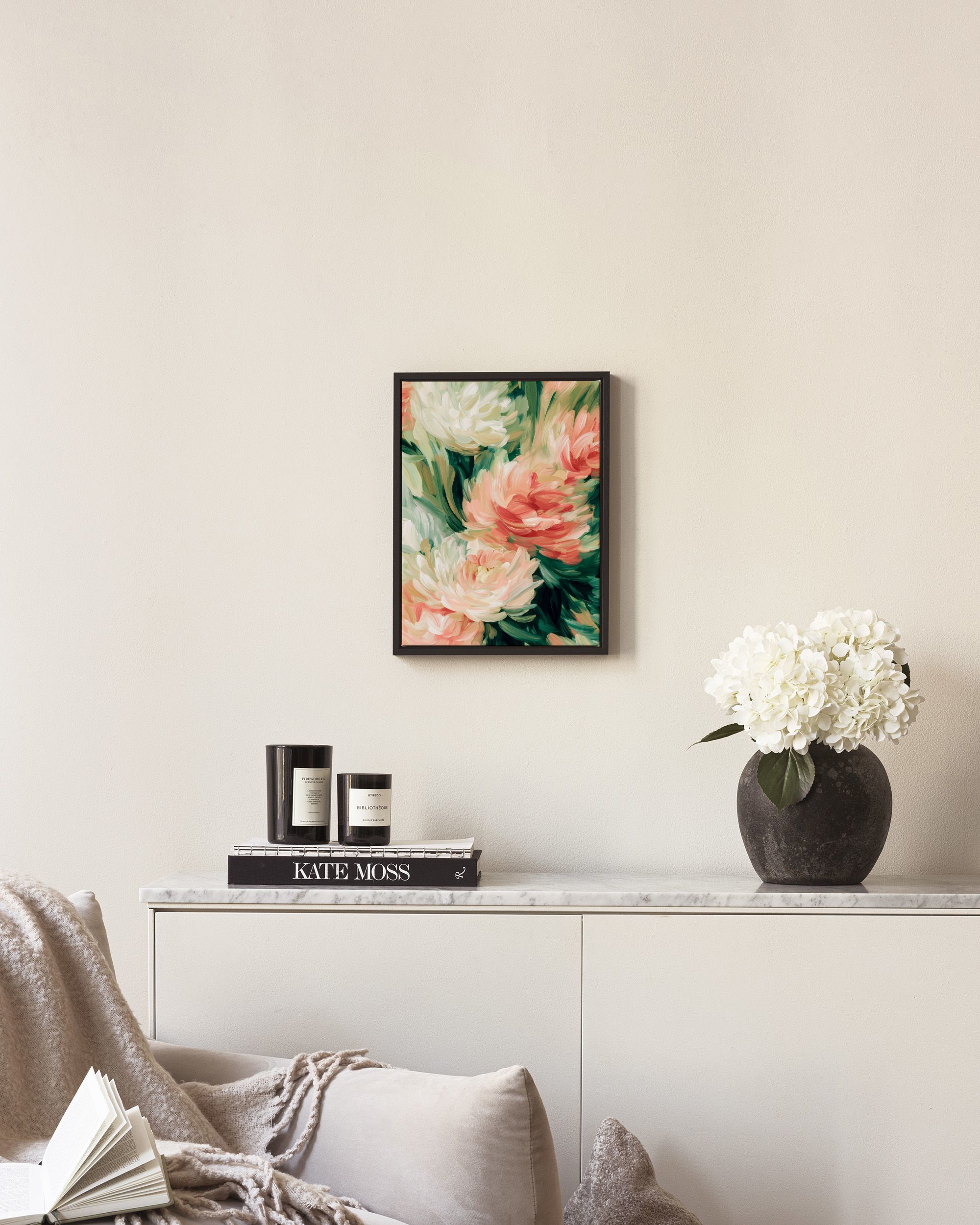 From $21.70A beautiful canvas print with a soft floral pattern in pink, peach, and white with green leaves. Perfect art to brighten up your home.