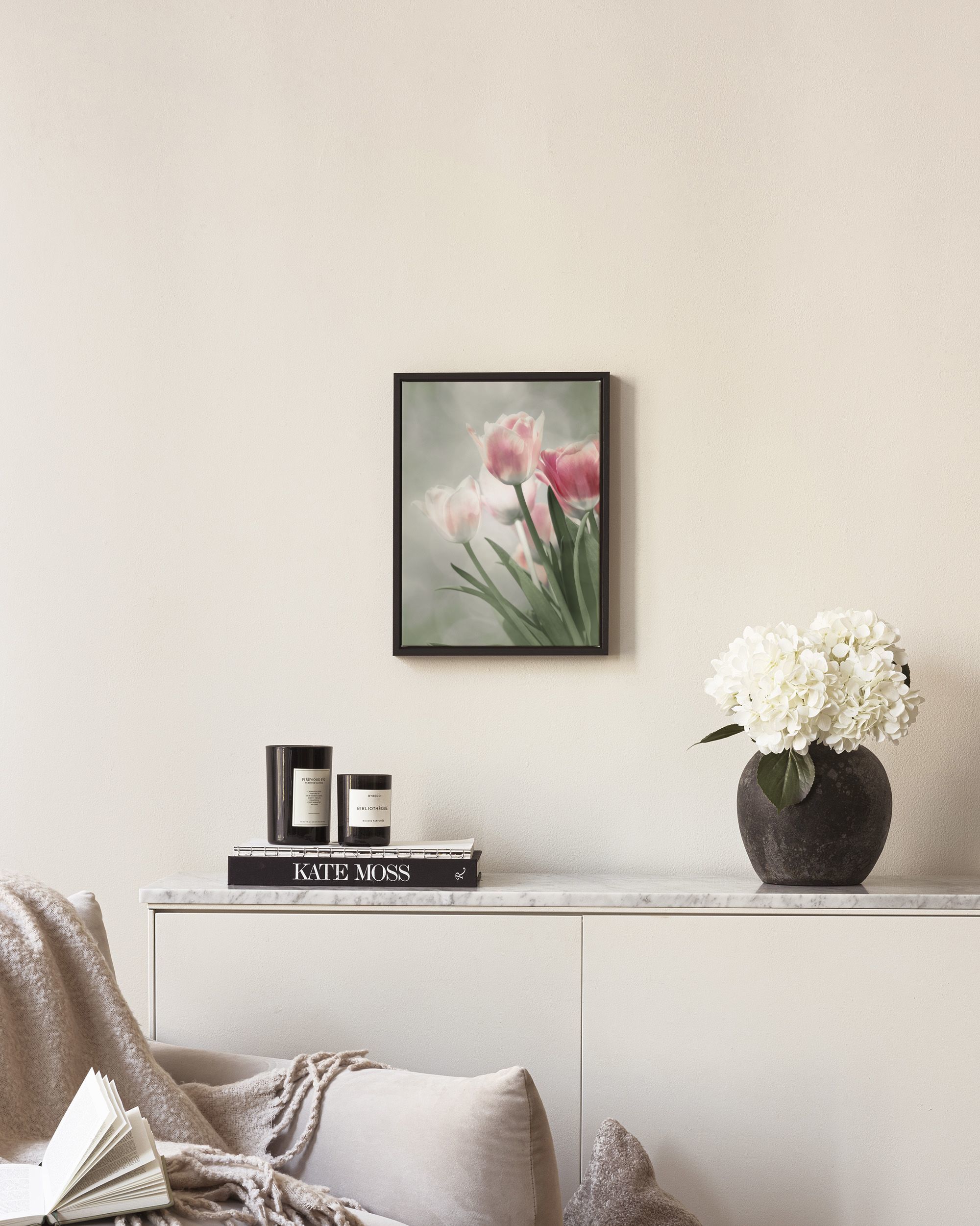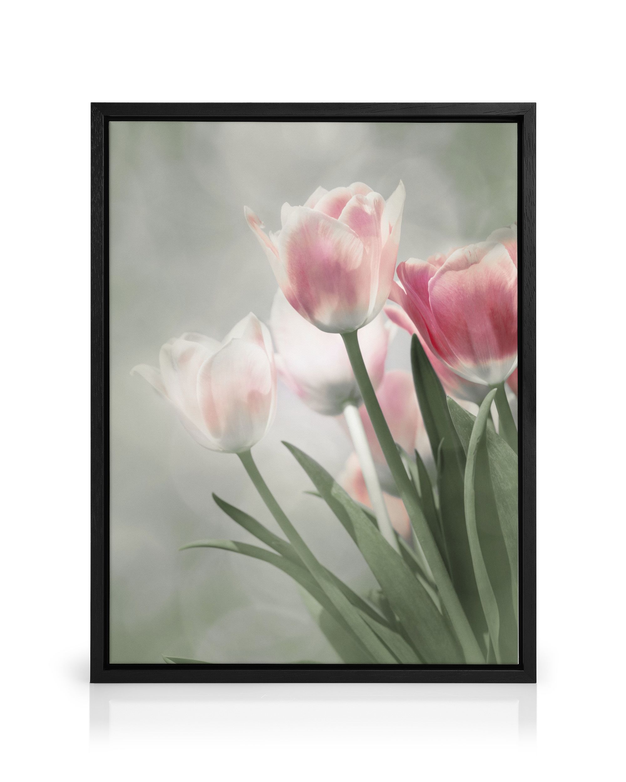 From $21.70A canvas print of pink and white tulips with green stems and leaves on a soft grey and green background. Perfect for bringing a fresh and serene look to your home.