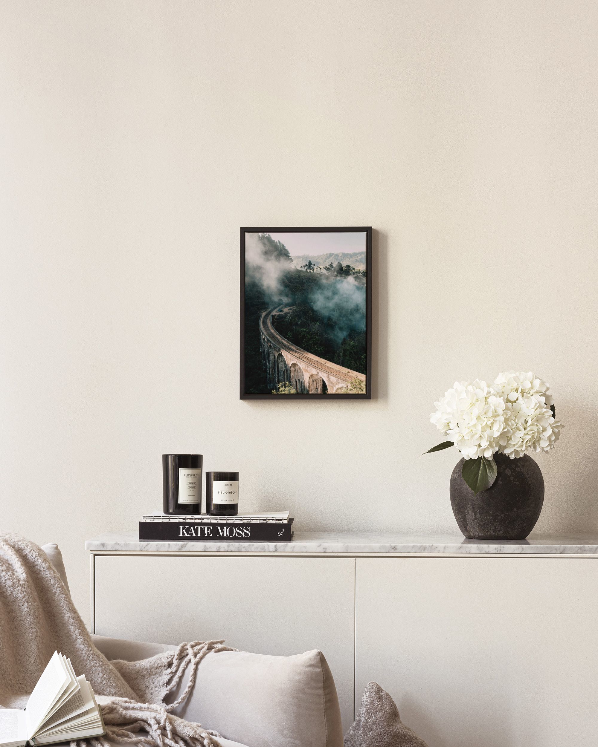A stone bridge with arches crossing a green valley surrounded by mist and dense forest. A railway track leads into a tunnel in the hillside.