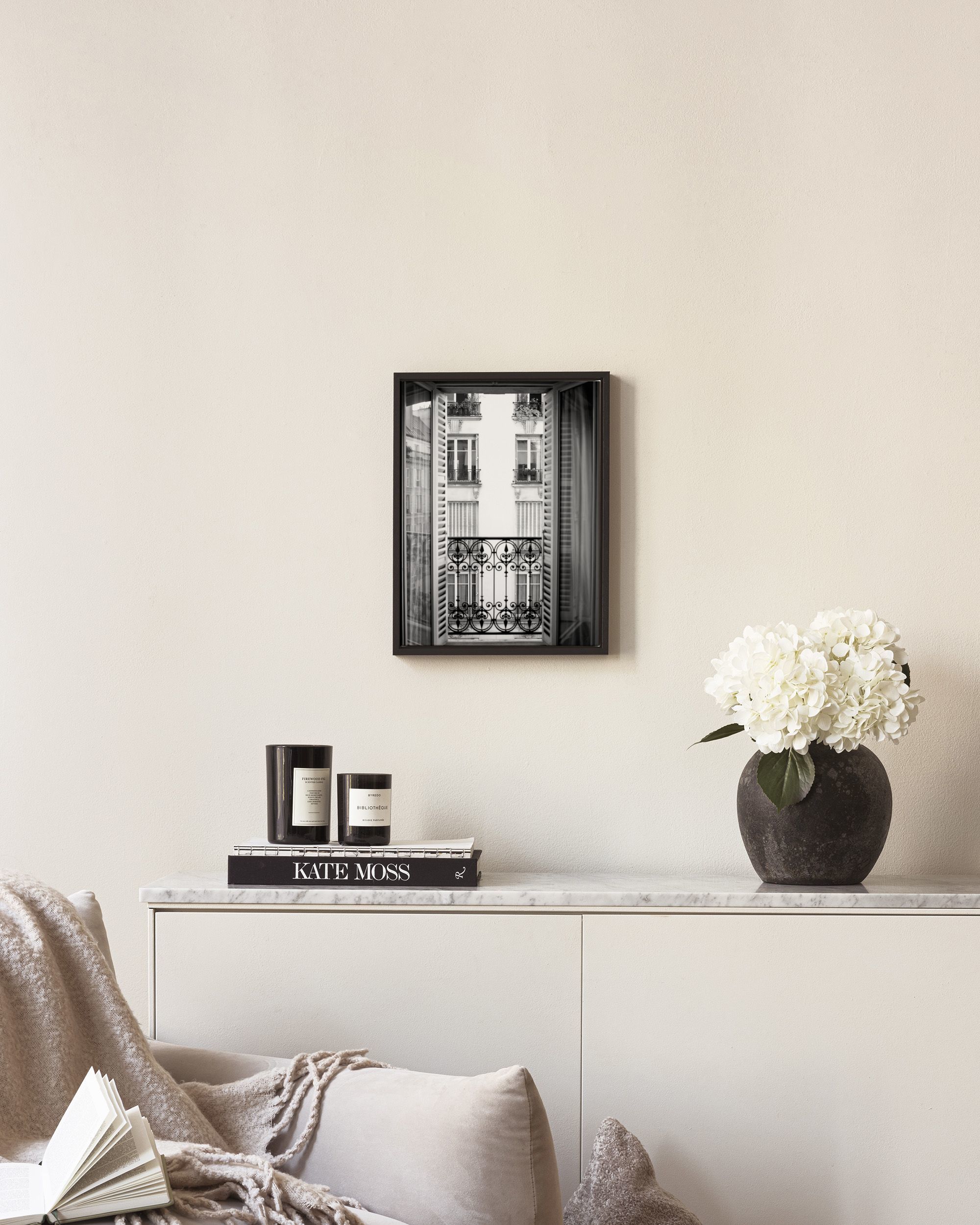 Black and white photo print of a Parisian window with shutters, showing a view of a building with iron balconies and plants across the street.