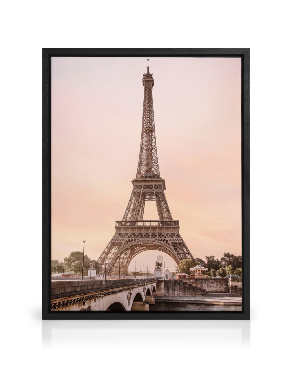 From $18.60A canvas print showing the Eiffel Tower against a pink and orange sky, with a bridge over the Seine river.