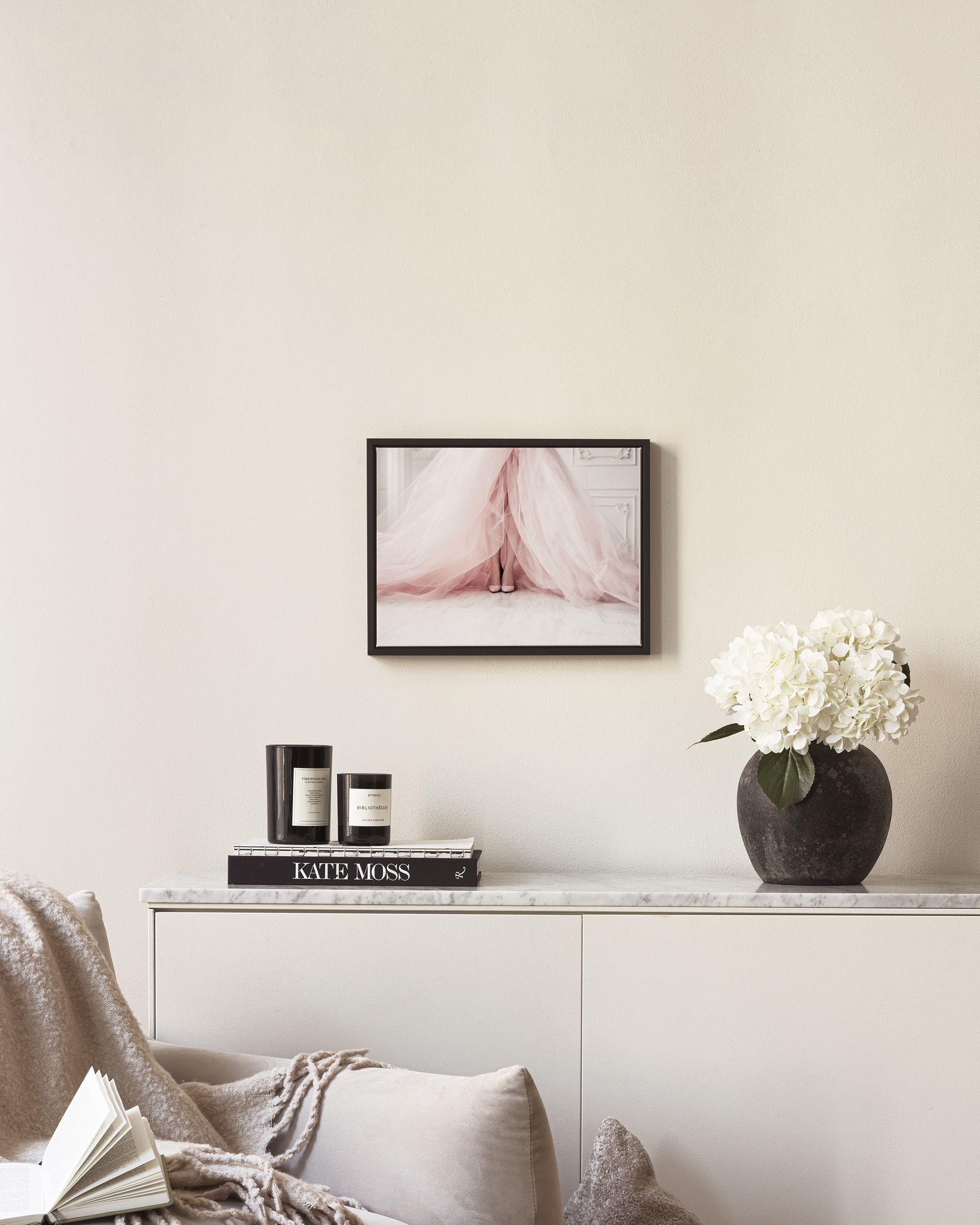 A print of a person wearing a flowing pink dress with soft layers. The elegant dress is shown against white walls with decorative mouldings, creating a delicate and stylish look.