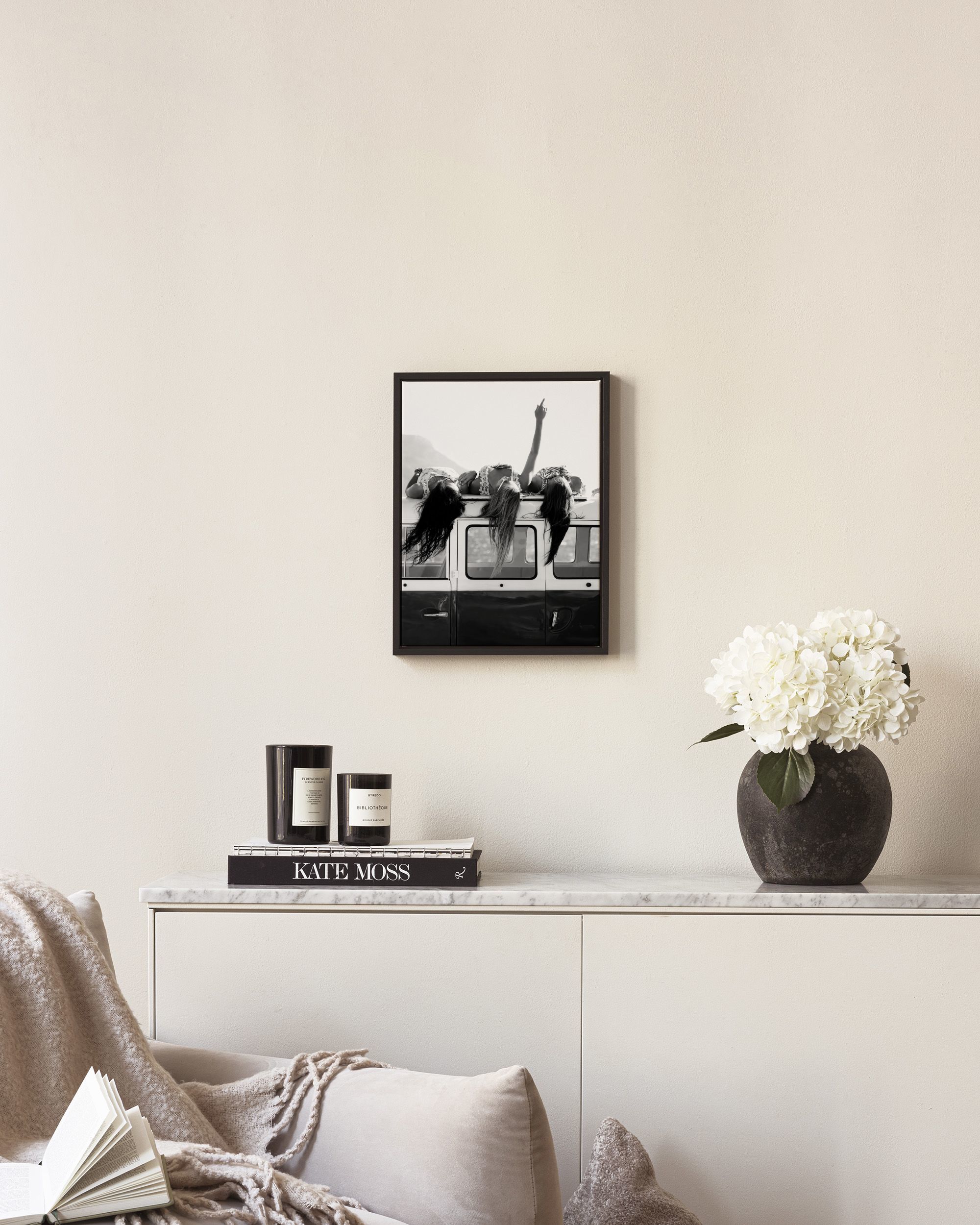 A black and white print of three friends lying on top of a van, with one person pointing upwards. Perfect poster for adding a fun and adventurous vibe to your wall.
