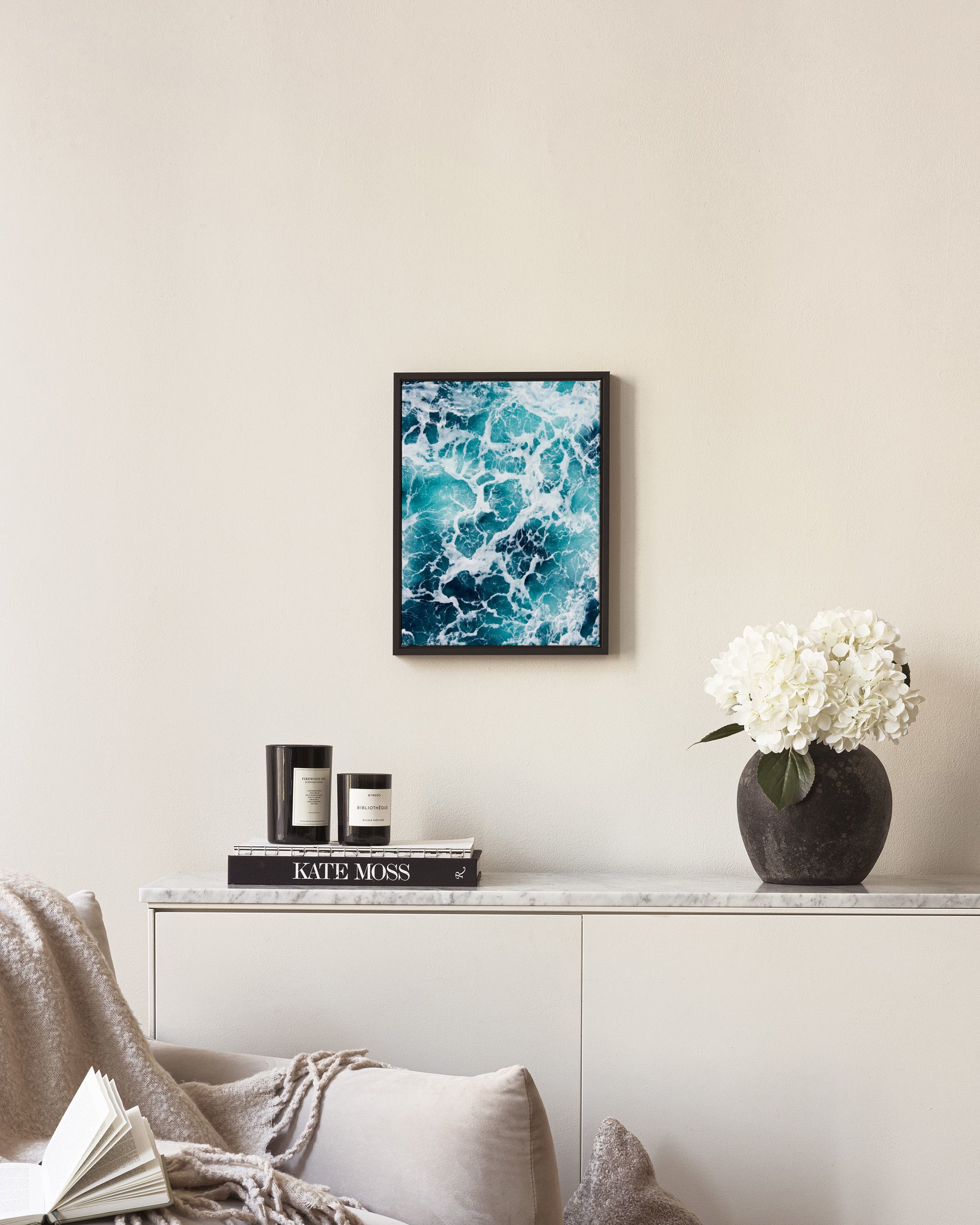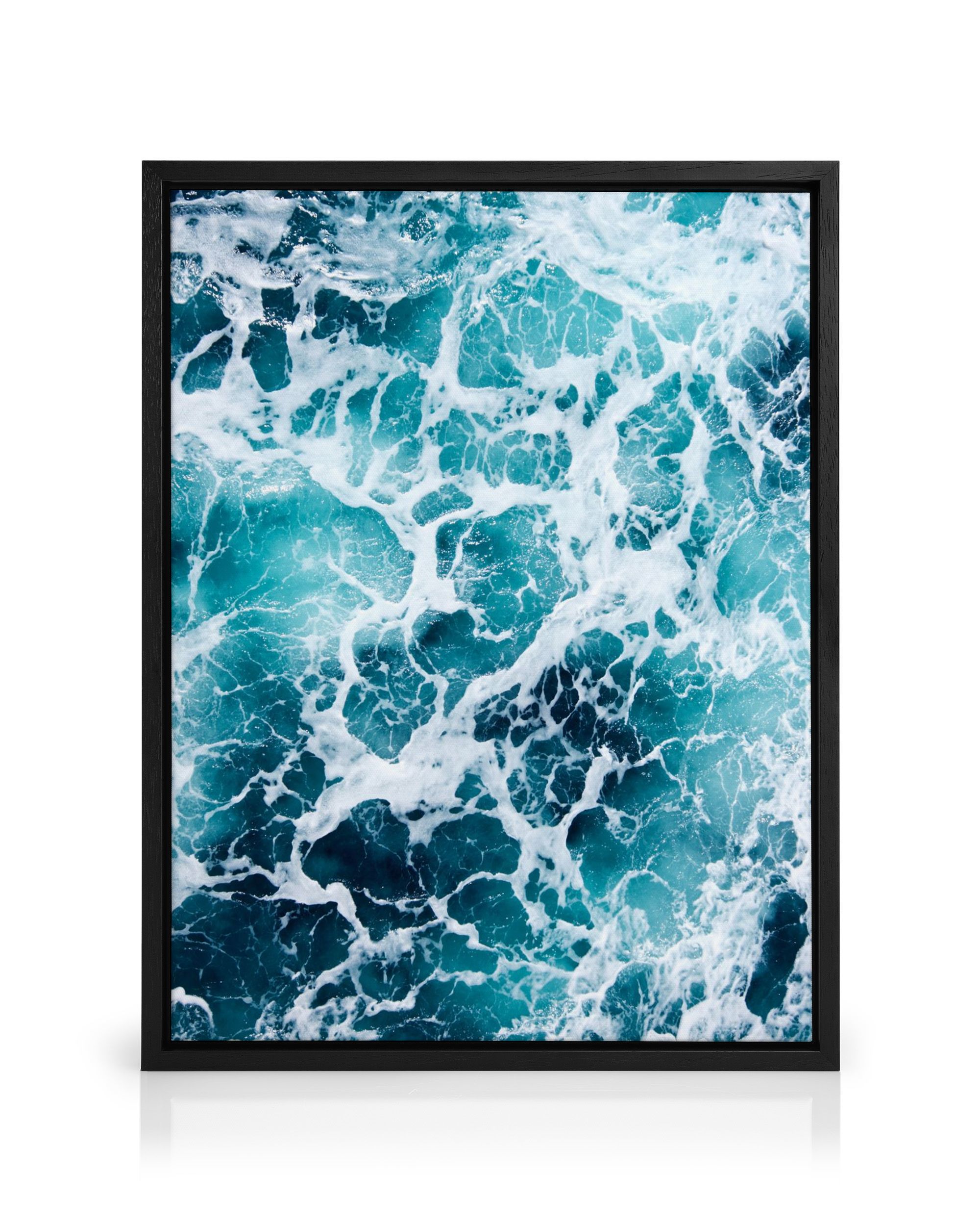 Beautiful aerial view print of ocean waves in turquoise and white with foamy, swirling patterns.