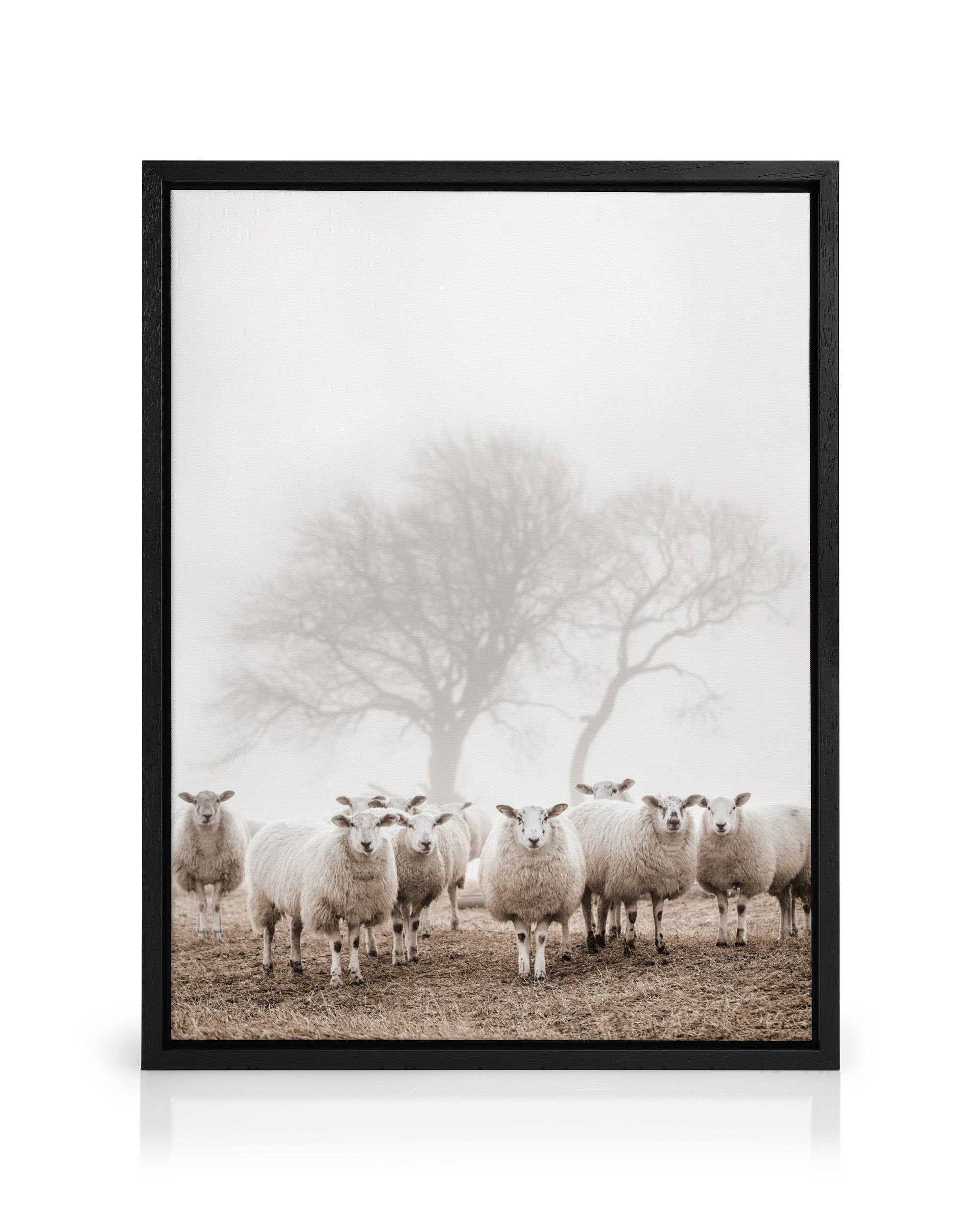A peaceful print of sheep with thick white wool standing on brown grass with bare trees in the background.