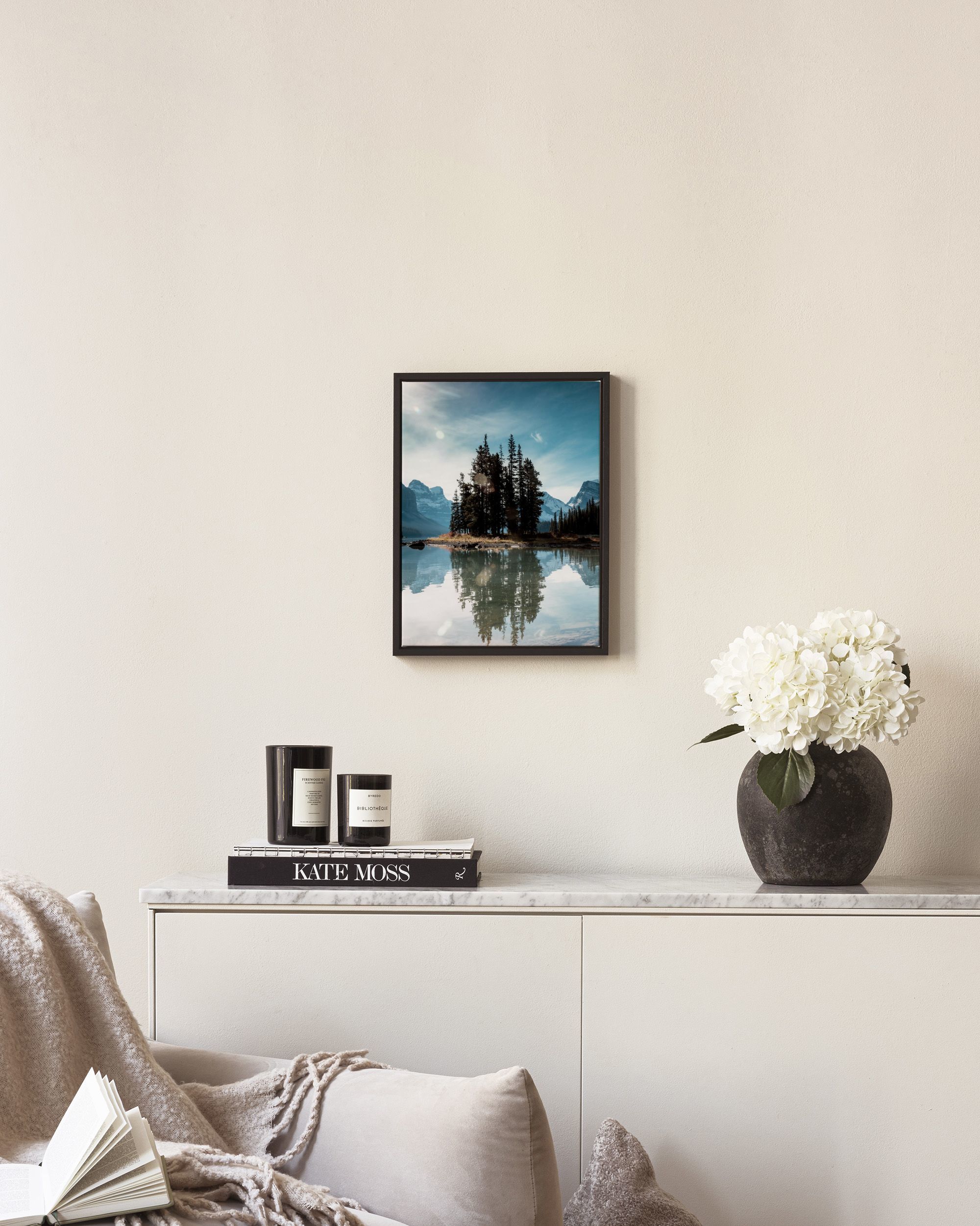 A beautiful print of tall pine trees on a small island surrounded by calm blue water. The peaceful scene features snowy mountains in the background and a blue sky with soft clouds.