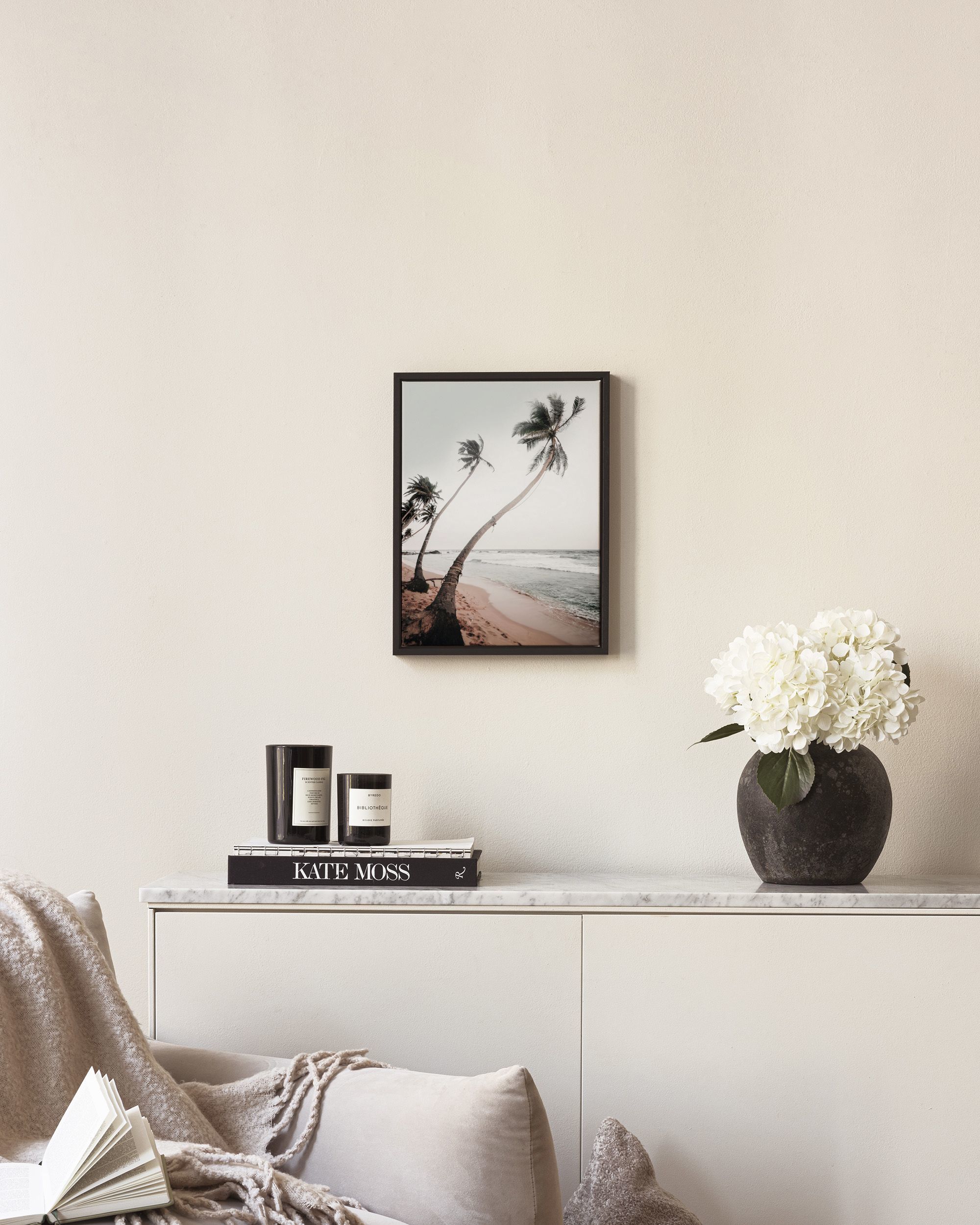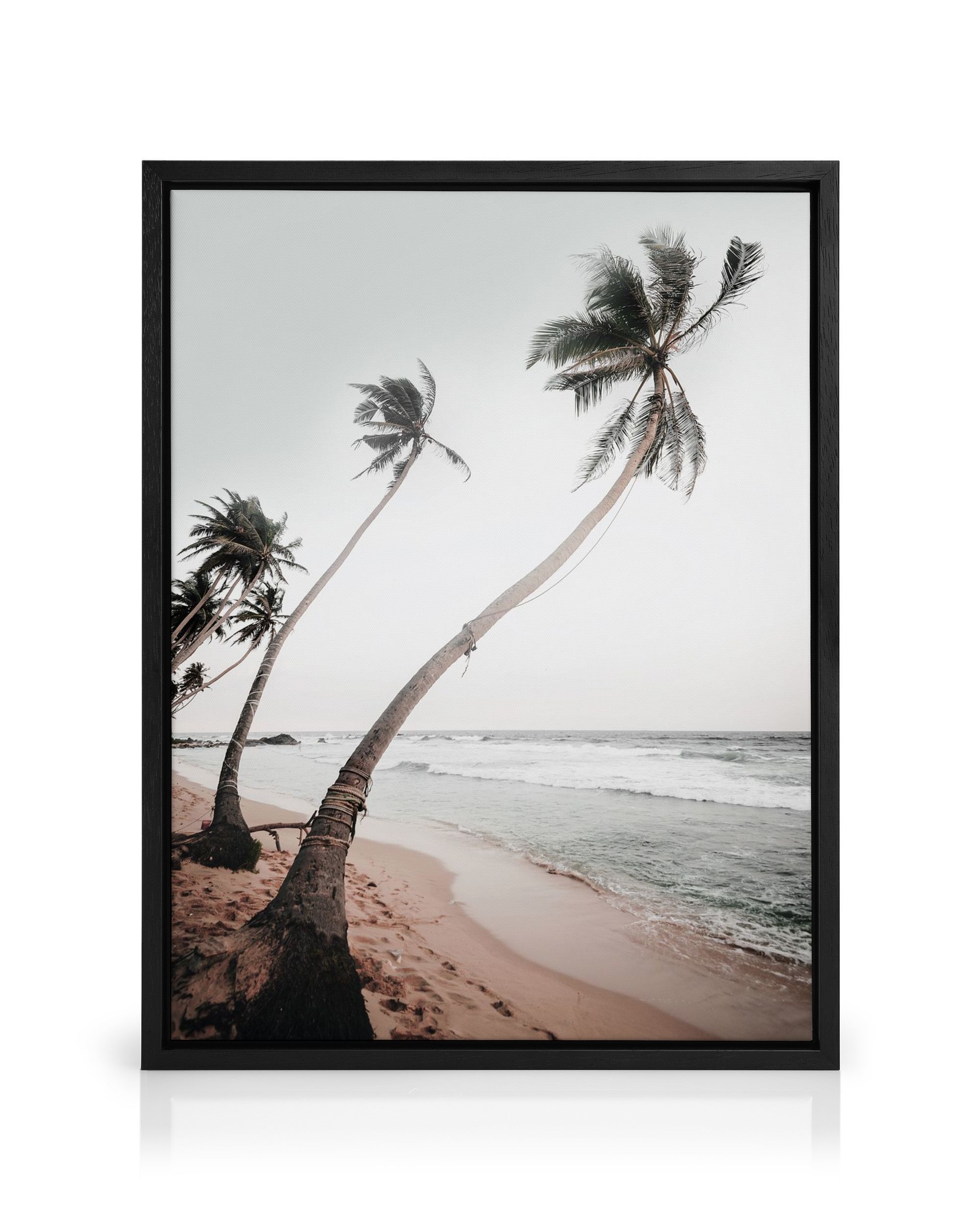 A peaceful beach print with tall palm trees over soft sand and gentle ocean waves under a grey sky.
