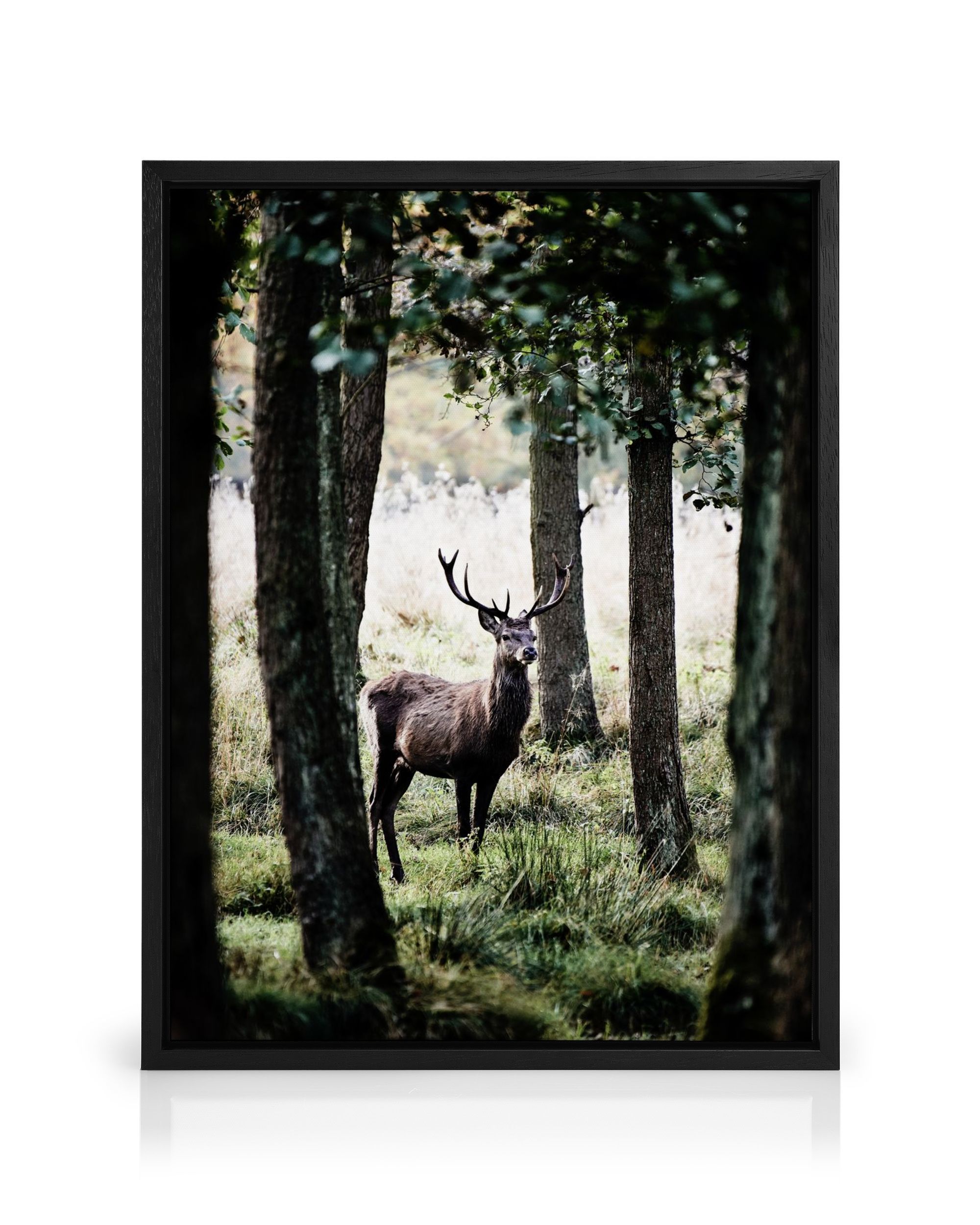A print of a deer with large antlers standing among tall trees with green grass and dark brown bark.