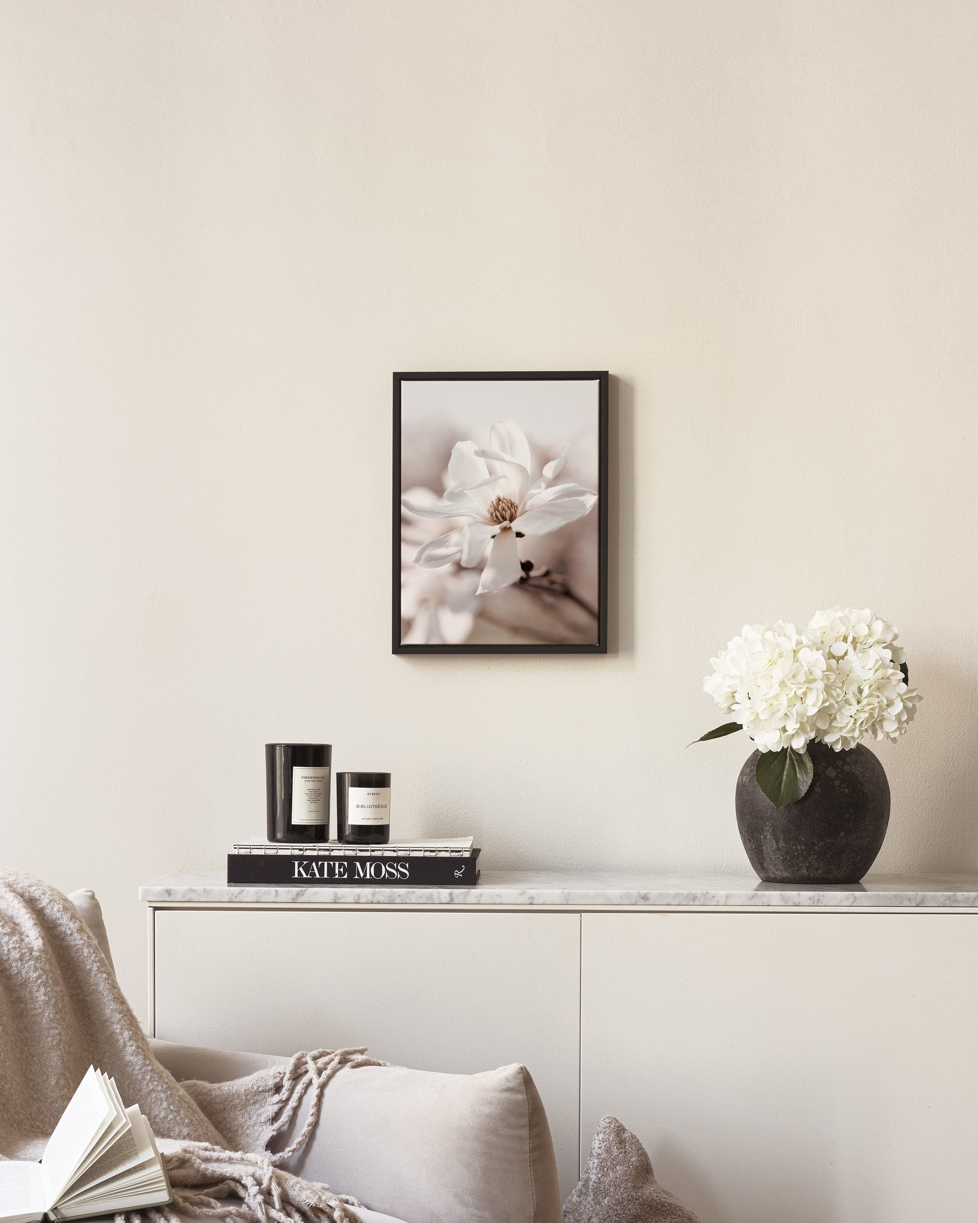 A close-up print of a white magnolia flower with soft petals and a light brown centre against a beige background.