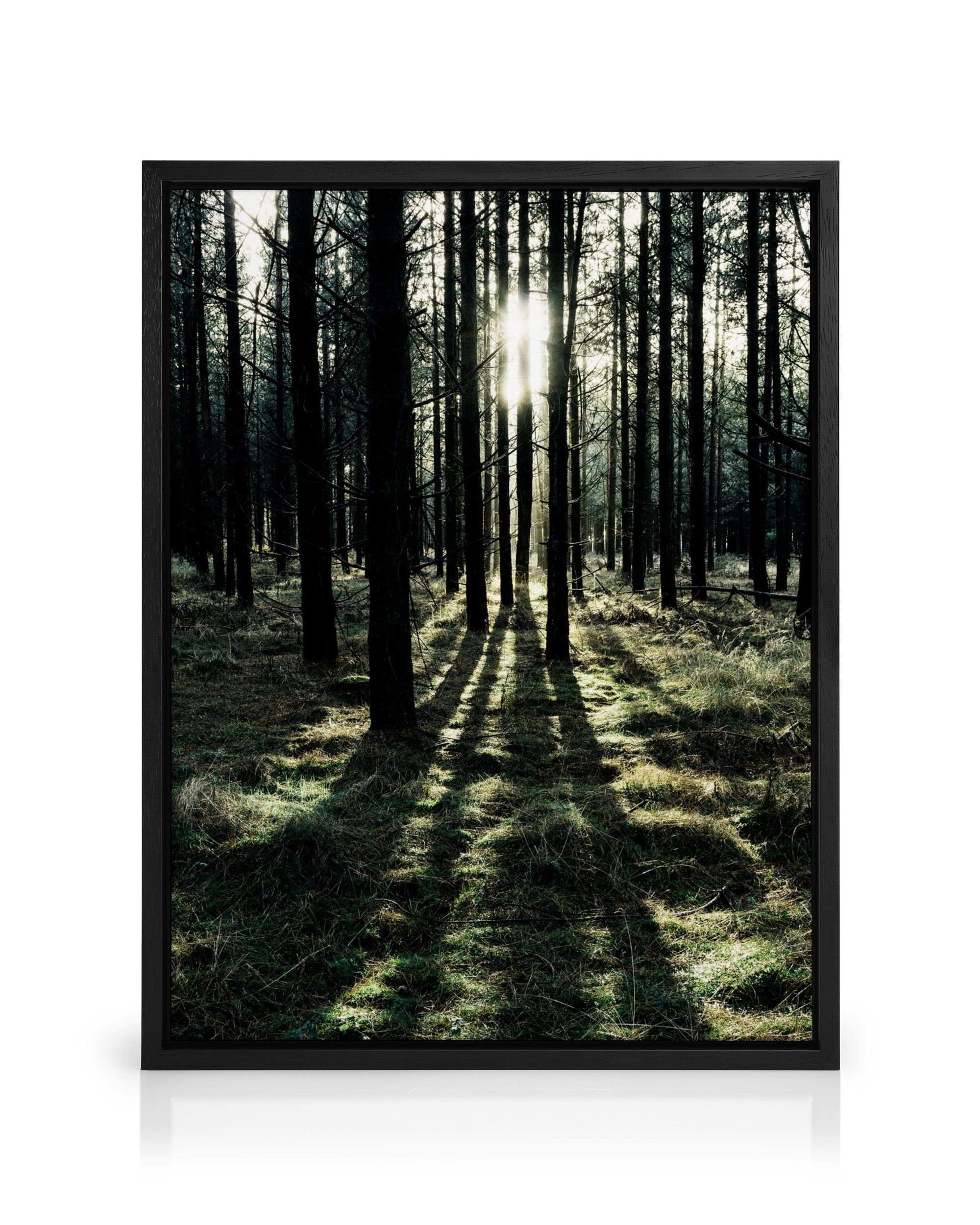 A peaceful forest print with tall trees and bright sunlight shining through, creating beautiful shadows on the forest floor.