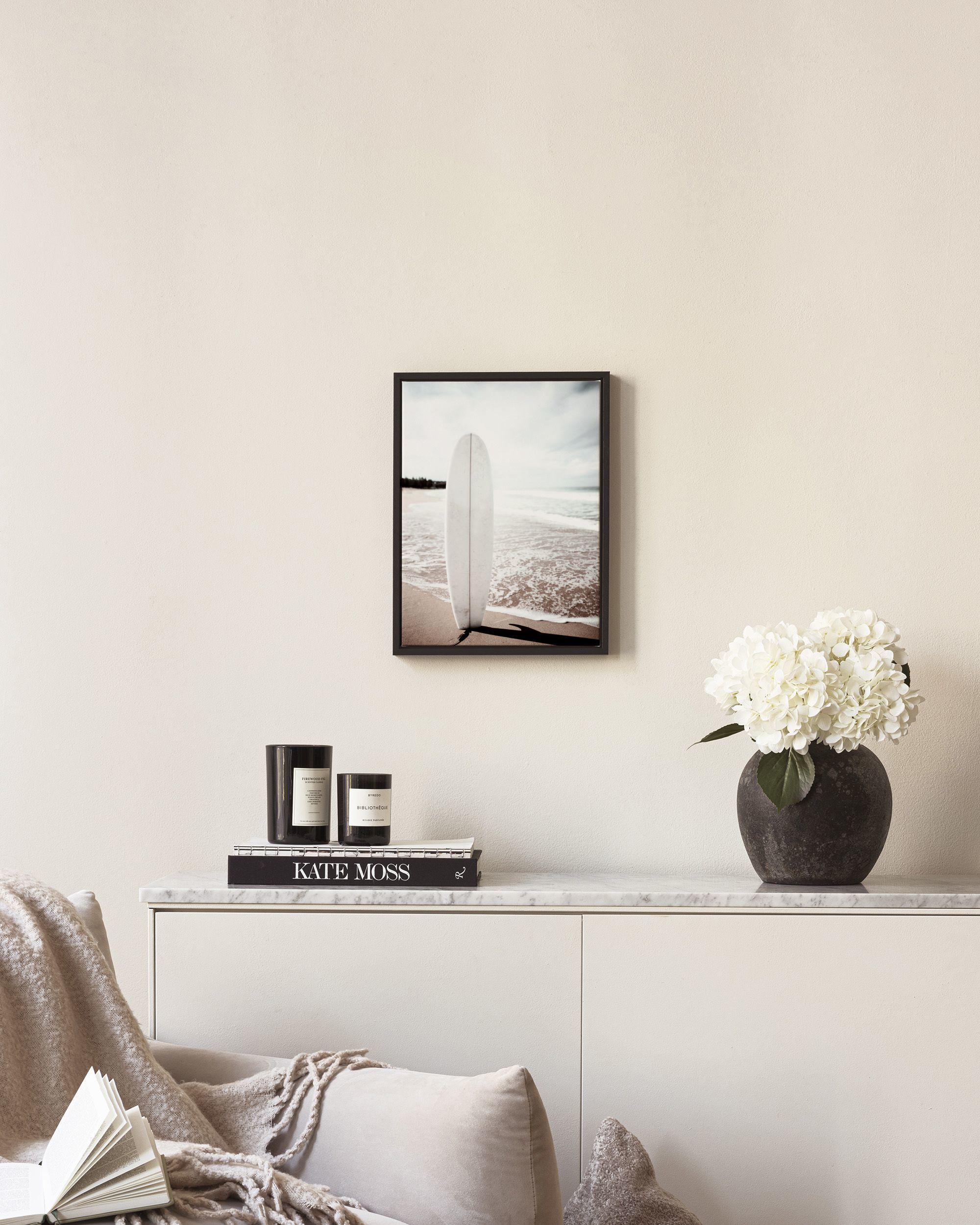 A white surfboard on a sandy beach with gentle waves and a cloudy sky. Perfect beach print for your home.