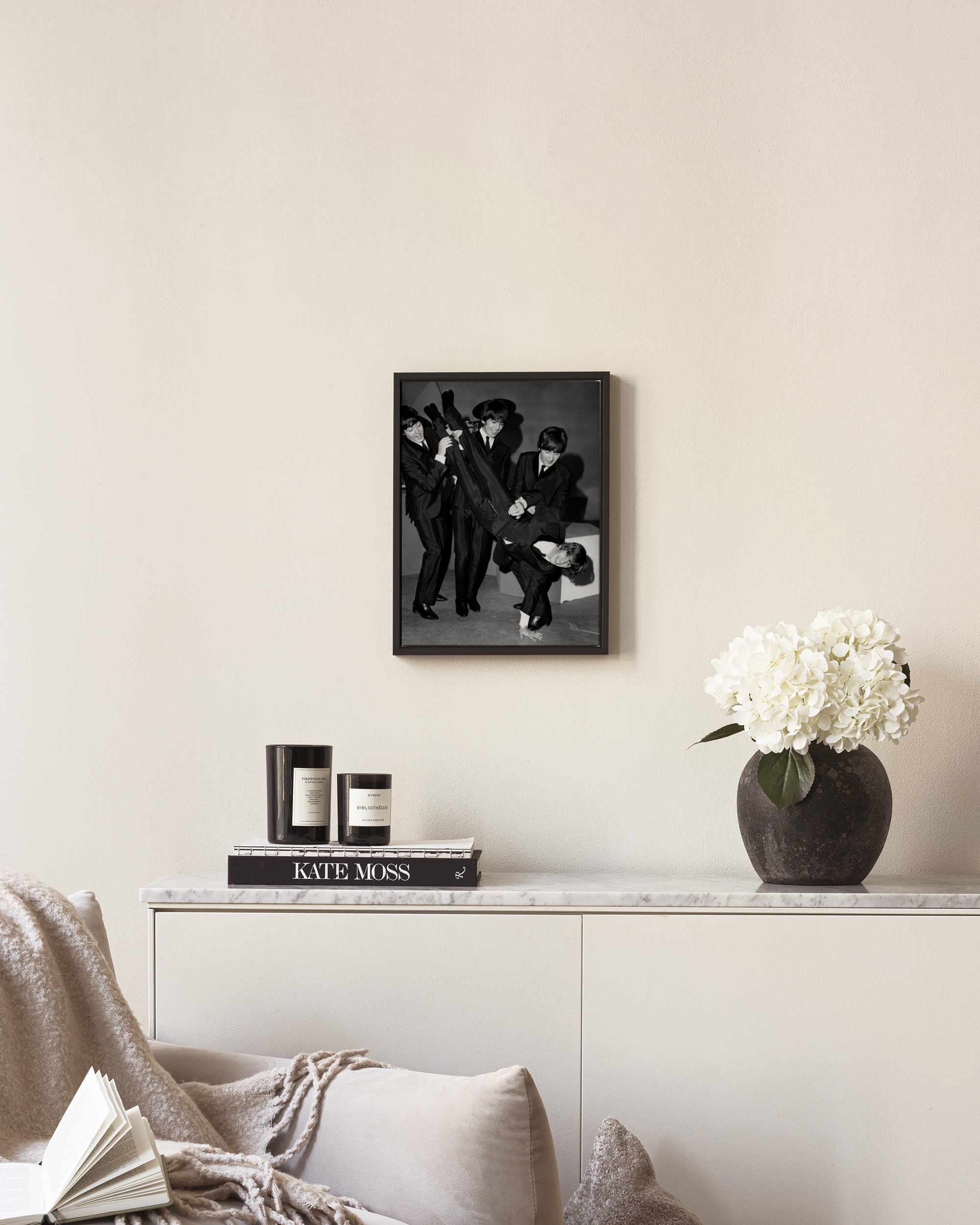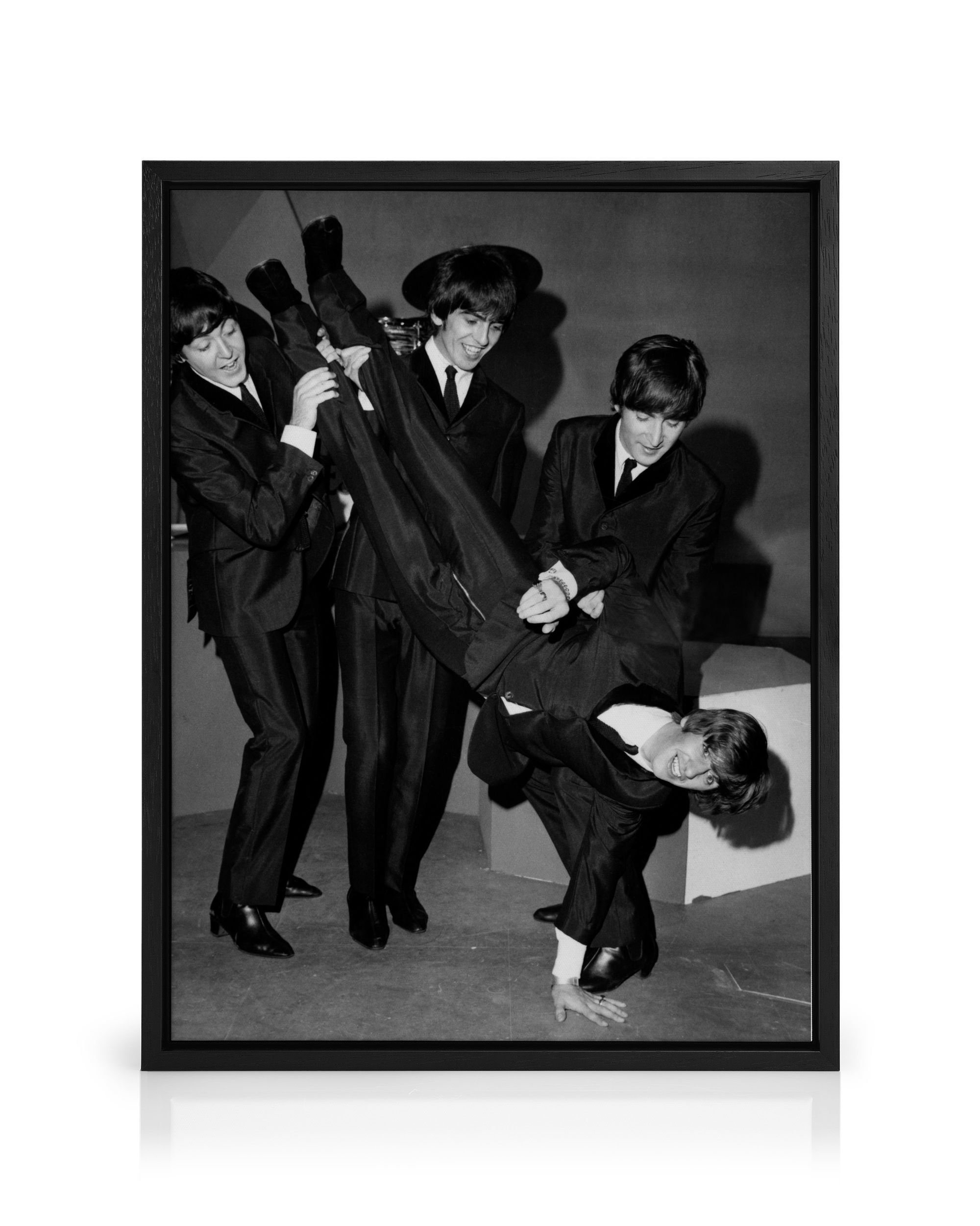 From $18.60A fun black and white canvas print of The Beatles messing around. John, Paul and George are holding Ringo upside down, creating a playful and happy scene.