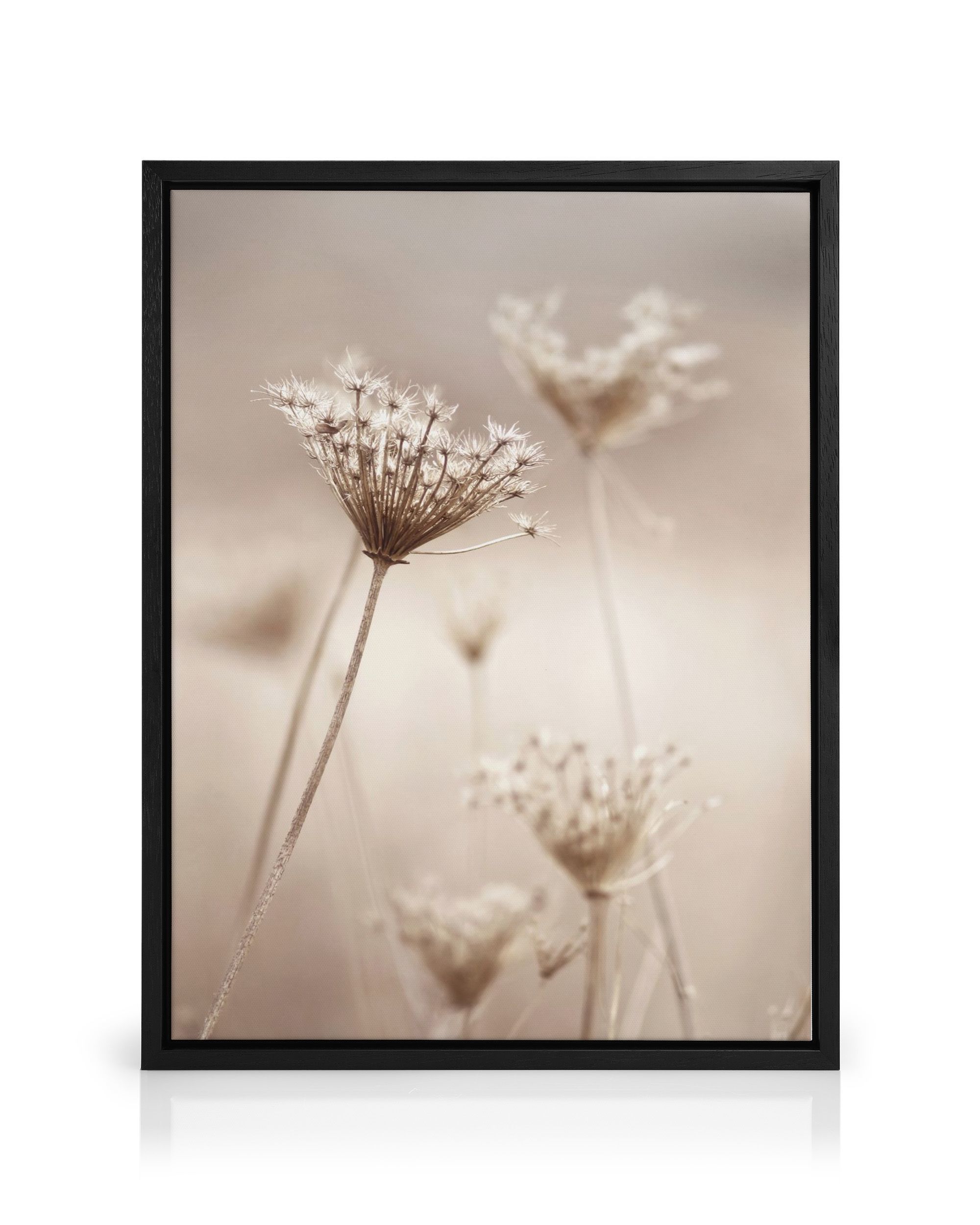 A beautiful print of dried wildflowers with thin stems in soft beige and light brown tones. Perfect for creating a calm and warm atmosphere in your home.
