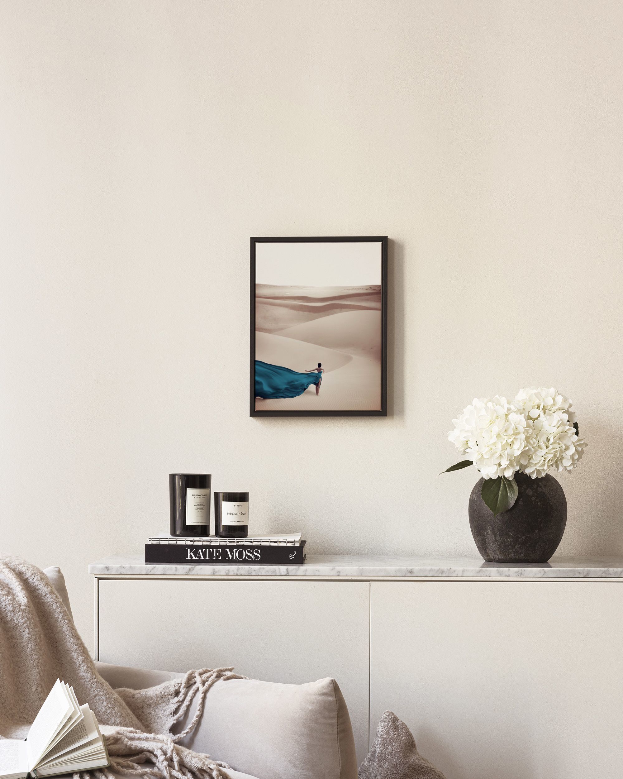 A print of a person in a flowing blue dress standing in a desert with sand dunes against a pale sky.