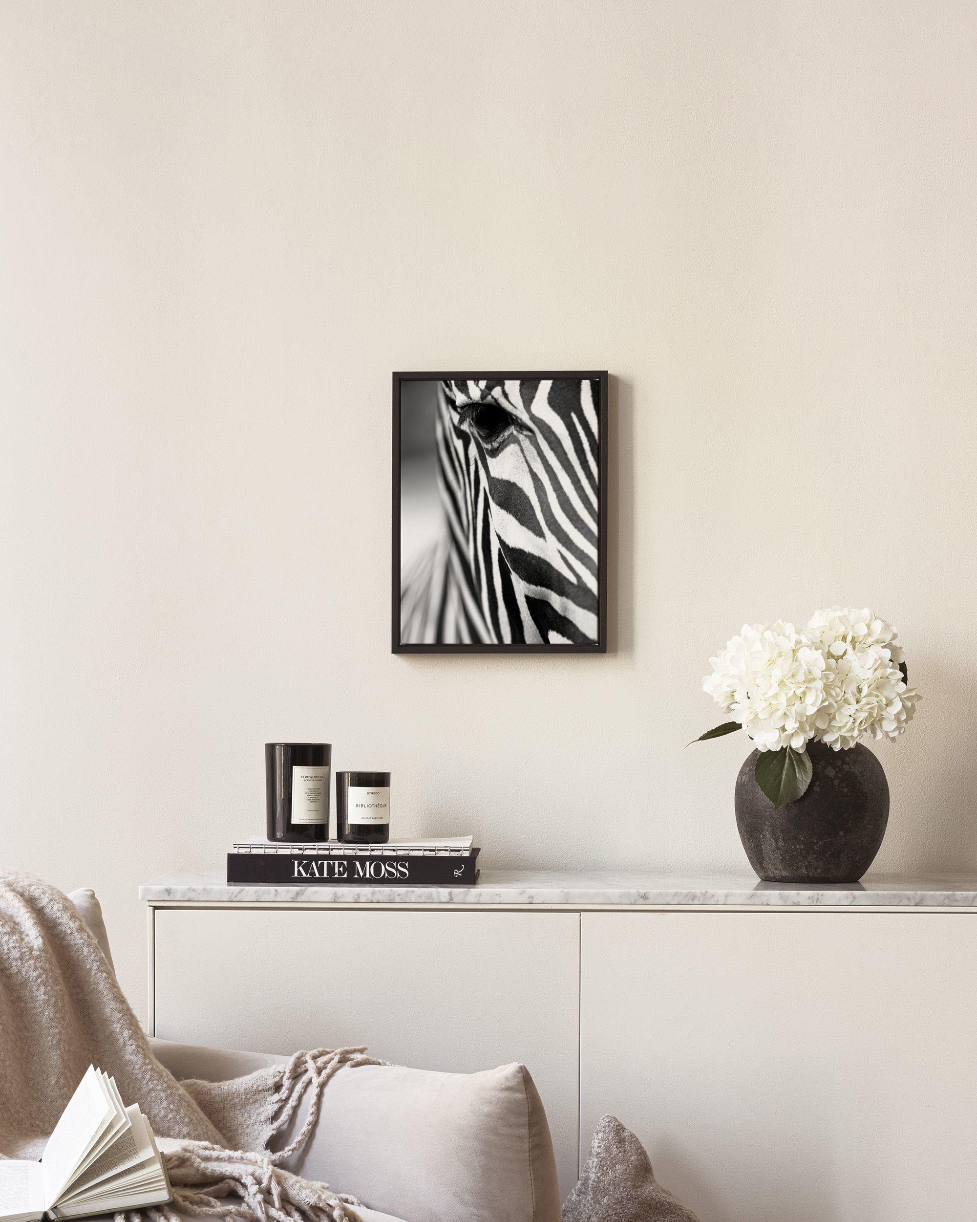 Close-up print of a zebra's face with black and white stripes. The zebra's eye is visible, surrounded by the distinctive stripe pattern.