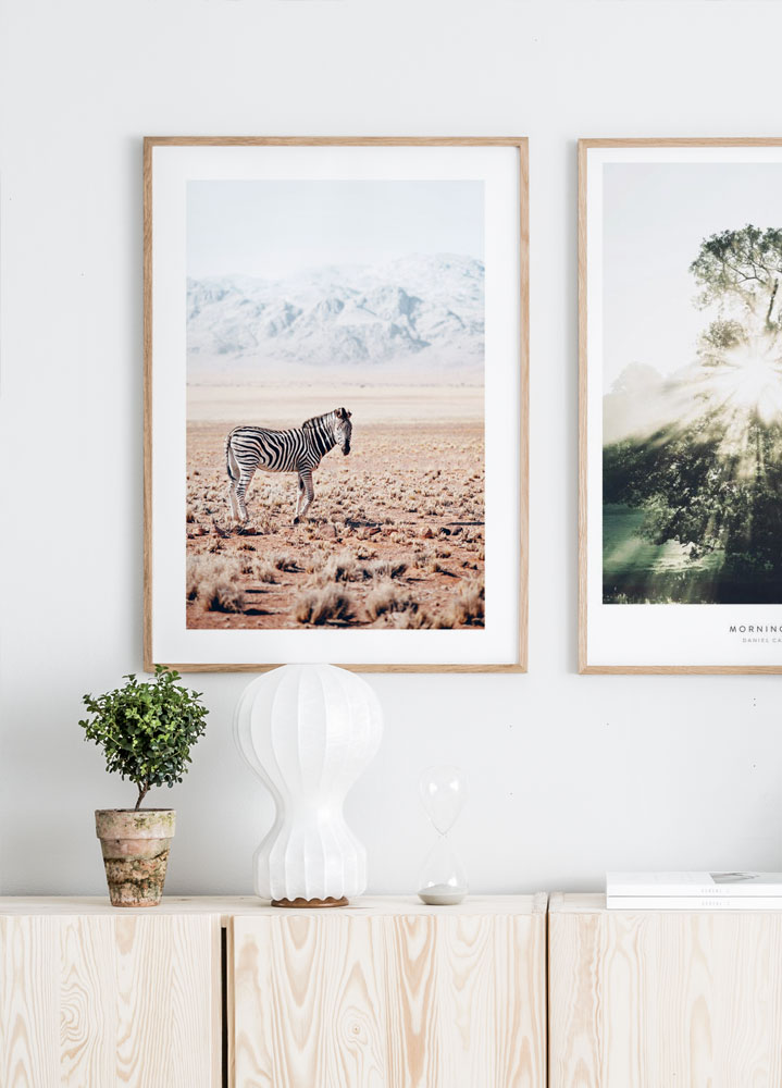 From $31Adorable animal poster with motif of a lonely zebra that roams freely in an open desert landscape. The zebra is different from the ordinary zebras because of the shorter ears and wider hooves. In the rear field of view, a beautiful mountain is visible in white which breaks off the warm tones of the subject in a contrasting manner. The poster has a printed white margin that frames the design.
