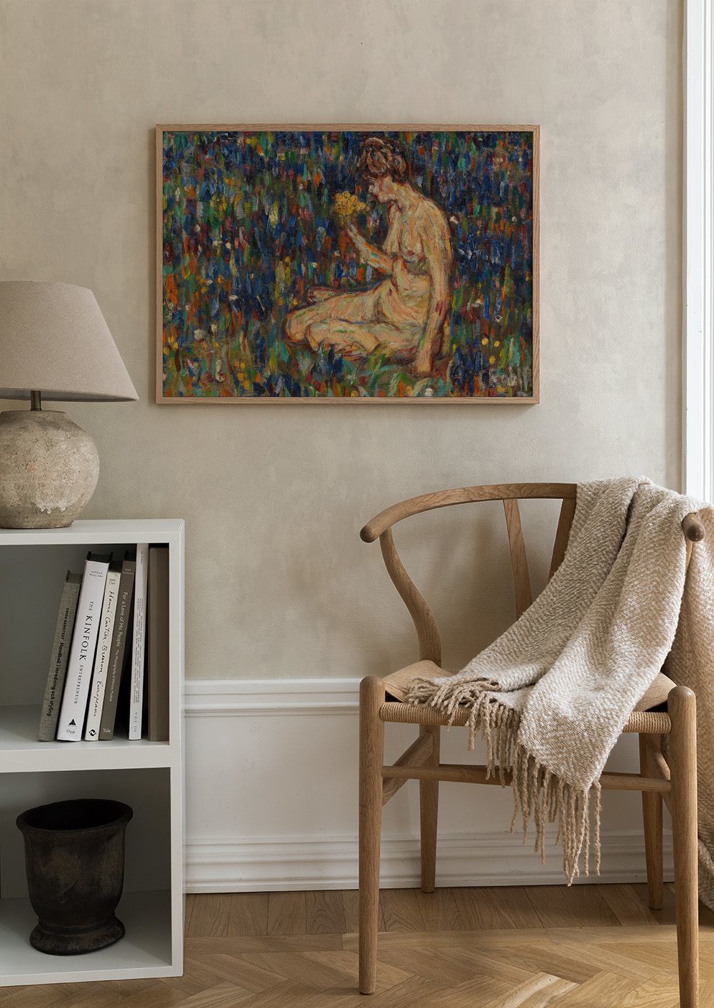 From $18.60A poster featuring a person sitting on the ground holding yellow flowers. The background is full of colourful brushstrokes in blue, green, red, and orange. Impressionist art print with thick paint and visible brushwork.