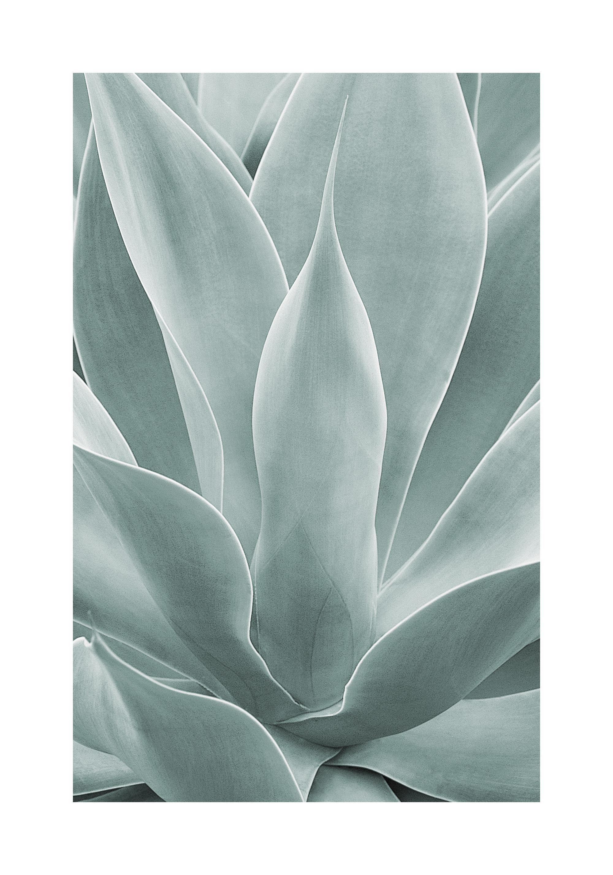 A beautiful botanical nature close-up poster of an Agave cactus. The slightly wavy leaves extend upward from the center of the plant and reveal the classic round shape of the Agave cactus. The grey-green colours give a fresh and soft impression.