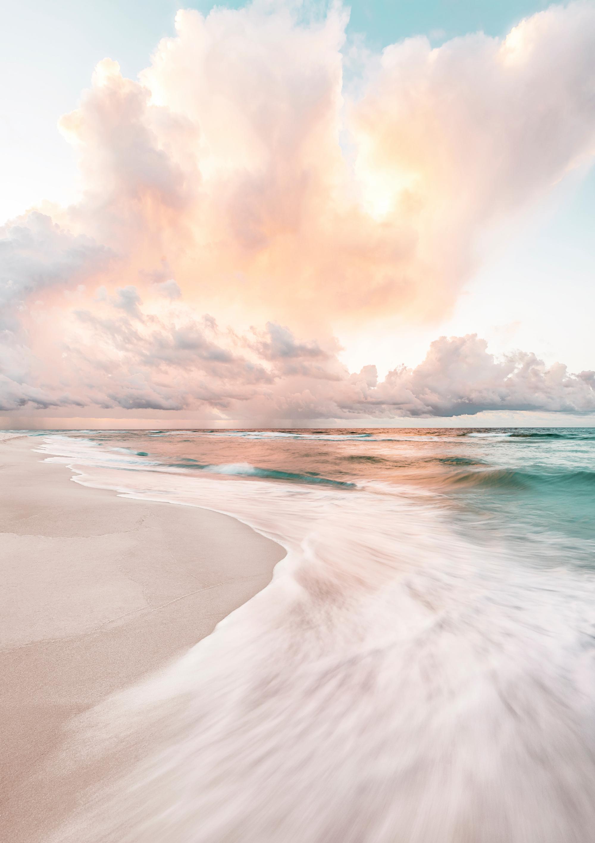 Magical landscape poster of a sunset on the beach. Feel the last rays of sun fighting their way through the cloud cover before the sun sets on the horizon and the waves hit the beach, powerful and full of energy. Bring summer to your walls with this photo print.